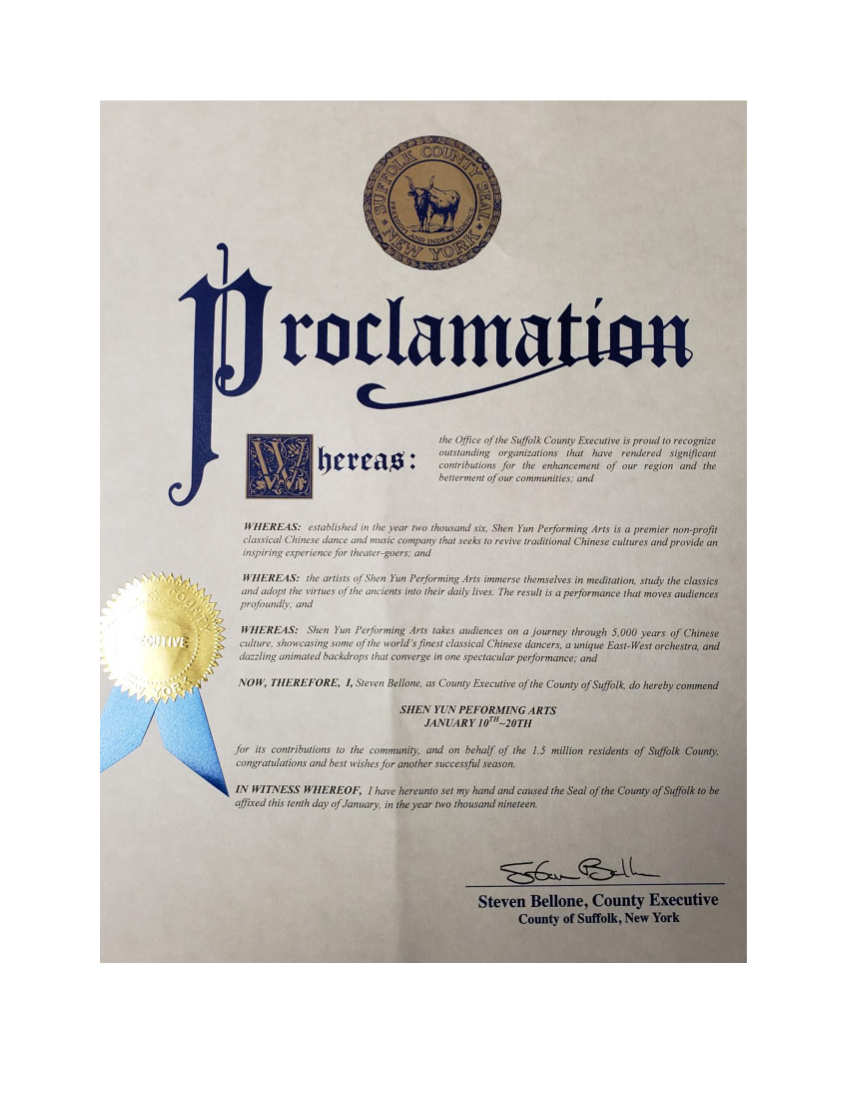 长岛苏福克郡(Suffolk County)郡长贝隆(Steven Bellone)在贺函中表示,“神韵艺术团将观众带上五千年中华文化之旅,神韵有世界上最好的中国古典舞演员,独特的中西交融的交响乐,绚丽的动态天幕,融汇在一台蔚为大观的演出中。”