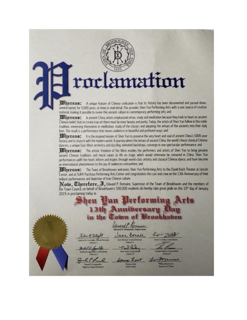 ![]() 图16:布鲁克黑文镇(Brookhaven Town)镇长罗曼恩(Edward P. Romaine)携市议员及政府官员给2019纽约神韵演出的贺函。 |