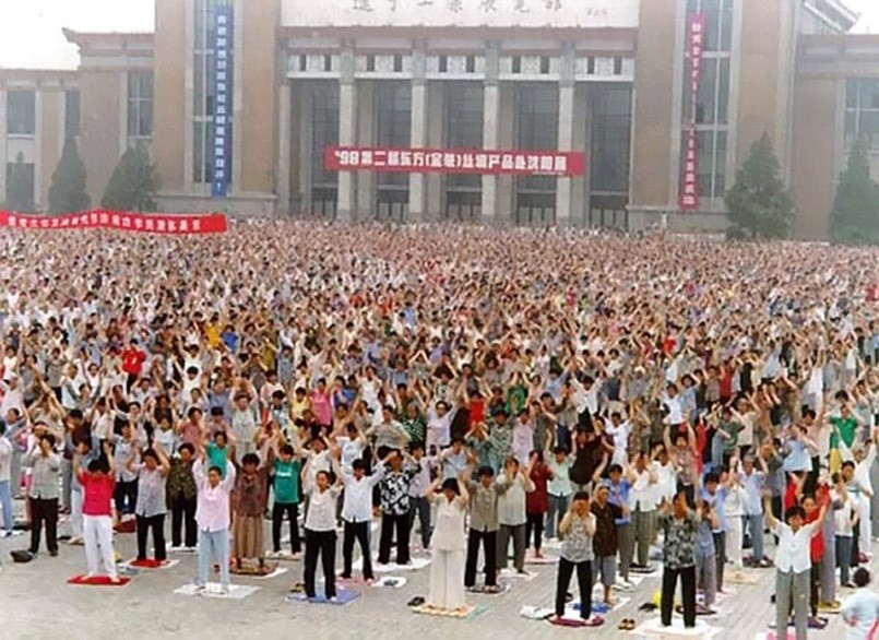 ![]() 图一:1998年沈阳万人集体炼功场景 |
