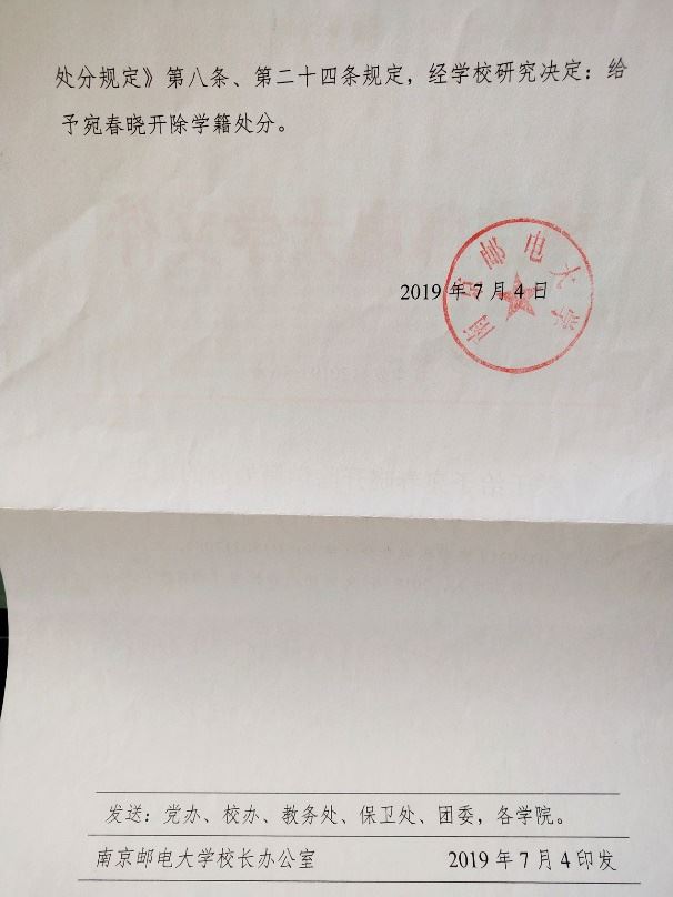 七月四日,宛春晓被南京邮电大学非法开除。