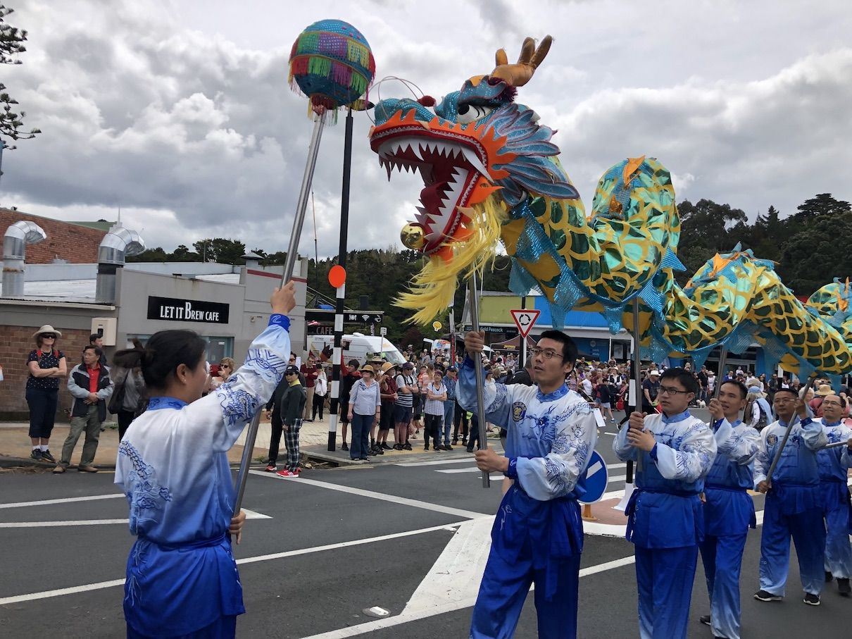 【明慧网二零一九年十月十四日】(明慧新西兰记者站报导)二零一九年十月十三日星期日,新西兰法轮功学员受邀参加了沃克沃思(Warkworth)的蔻伐艾(Kowhai)节日。整个城镇中心,上百个摊位,各式商品琳琅满目,各种食物热气腾腾,满街飘香,各种表演,还有社区游行,再加上游乐场上孩子们的笑声,一派节日热闹景象。法轮功学员组成的腰鼓队和舞龙队参加了蔻伐艾节的游行。
