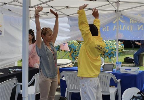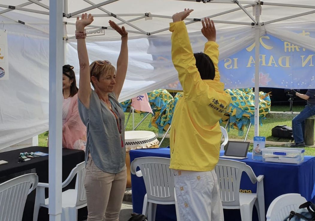 在法轮功学员们的真相展位上,也是人头攒动,有的来询问如何学习法轮功,有的来购买法轮大法书籍,有的来参加手工莲花制作和书法互动的。不少当地人非常淳朴,十分认同中华文化的博大精深,表示要上网下载教功录像和《转法轮》,学习了解法轮功。