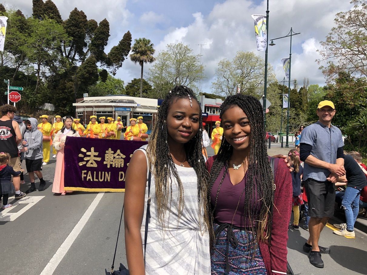 艾芙蒂(Evody)和辛西娅(Cynchia)俩姐妹开心地告诉记者,她们一家人一年前从南非移民来新西兰。她们很喜欢腰鼓队明亮的服装,阵阵鼓声都让她们回想起家乡,因为这种鼓声和他们家乡的鼓声很相似。她们非常喜欢在新西兰各种民族在一起,互相友爱,互相学习,分享各自不同的文化。这是一件非常美好的事,让她们有归属感。当得知中共迫害法轮功学员,她们觉得非常不可思议,因为打坐在她们看来是一件很棒的事情。