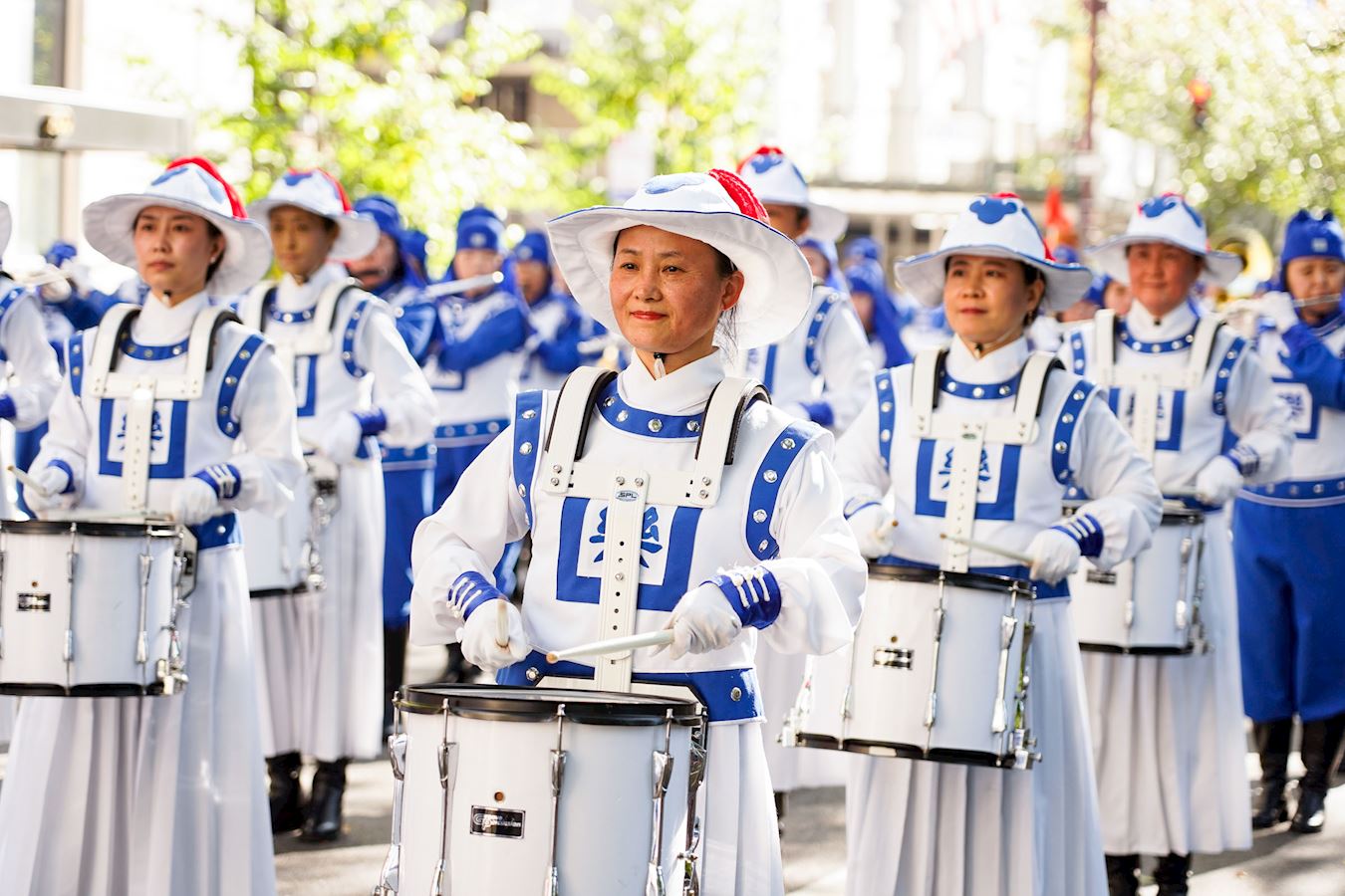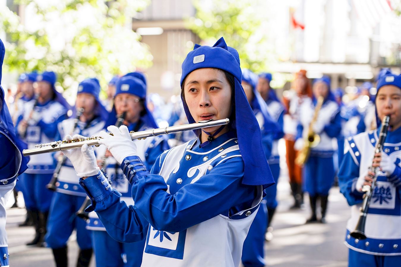 由法轮功学员组成的“天国乐团”在游行队伍中备受瞩目,他们身穿中国古装,脚穿长靴,踏着整齐有力的步伐,气势轩昂,如天兵天将下凡,为观众带来多首乐曲,如“法轮大法好”、“凯旋”、“神圣的歌”、“法鼓法号震十方”、“法轮圣王”、“送宝”,以及广受美国民众欢迎的美国国家进行曲——“星条旗永不落”。