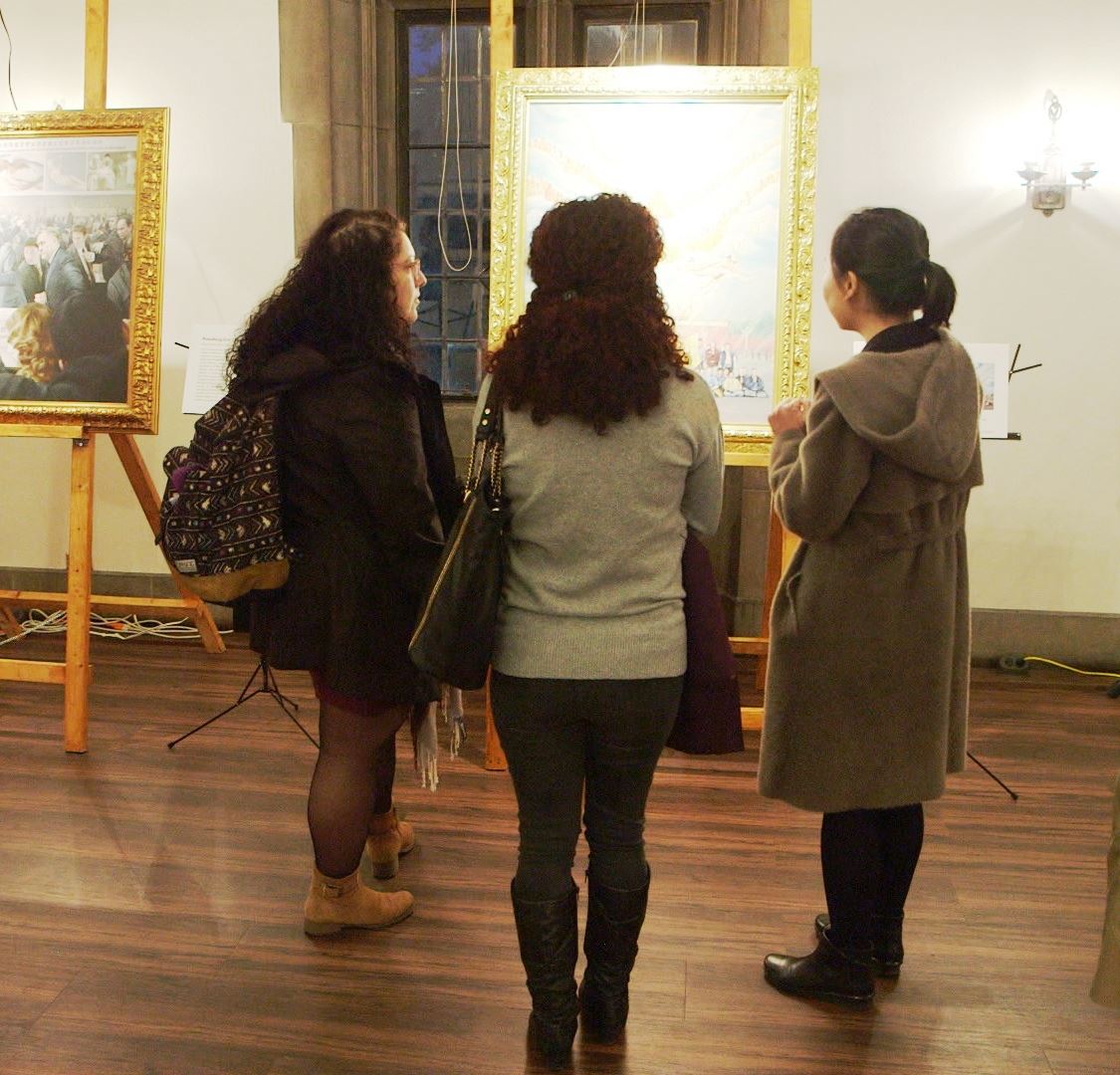 图8:一家国际律师行事务所的人力资源经理佩鲁兹(Perouz,左一)于十月十六日在多伦多大学观赏“真善忍国际美展”。