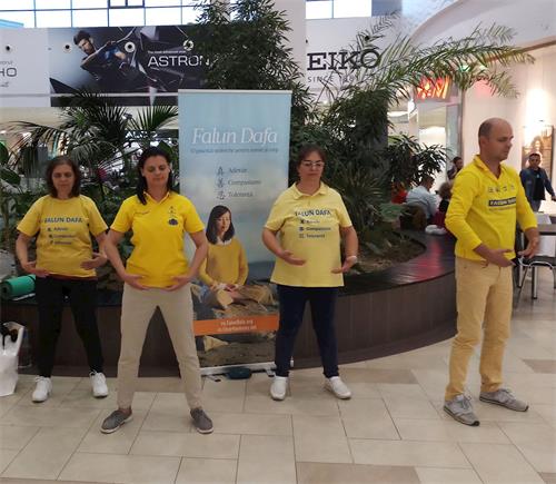 几个年轻人看到学员们展示的功法,询问这是什么,他们以为是瑜伽。一位学员向他们展示了如何正确地炼功,另一位学员给其中的一位年轻人讲真相。学员告诉他,这是法轮大法的功法——来自中国古老文化的气功修炼,而瑜伽来自印度,他们是不同的。除了修炼功法之外,法轮功学员们还要遵守“真、善、忍”作为生活和工作中的指导原则。年轻人问:“耐心,不是吗?”学员回答说,当然,如果不遵照“真善忍”去做,不修心性,仅仅炼功就只是一项运动,没有心灵健康就没有身体健康,而遵循“真善忍”原则恰恰在所有日常工作生活中都具有这种治愈作用。年轻人立刻明白了,他的态度从轻视变得尊重起来。他耐心而恭敬地等待着学员给他讲更多细节。之后,学员告诉他法轮功在中国遭受迫害的真相,他说他不敢相信现在居然有这样的事情发生,并感谢学员提供的信息。