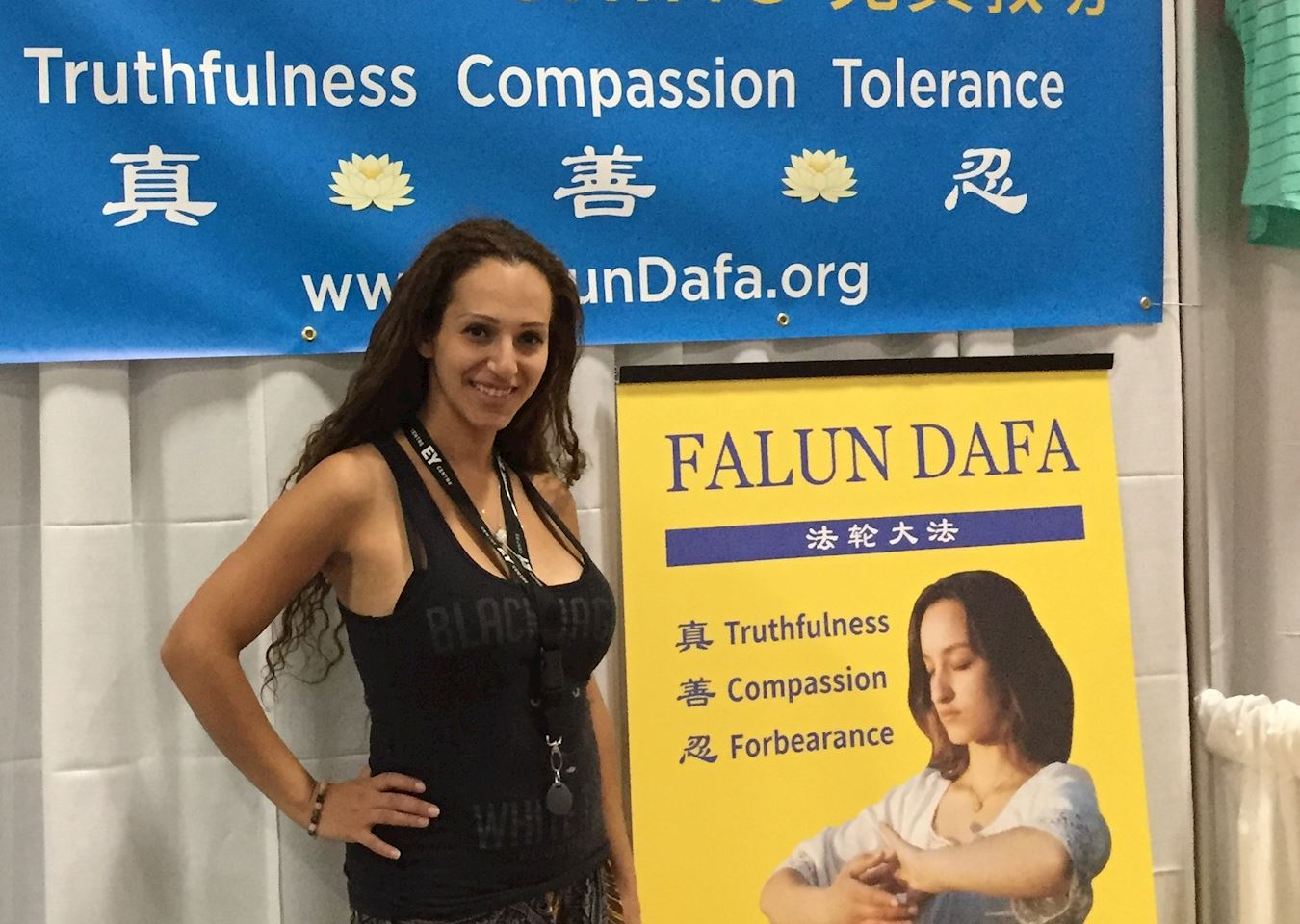 她非常欣赏法轮功的功法,她说:“打坐炼功是通过静心调息的方式让你的生活更加美好。早上十几分钟的打坐可能会让你自主的控制一天的生活,而且真的有效。”