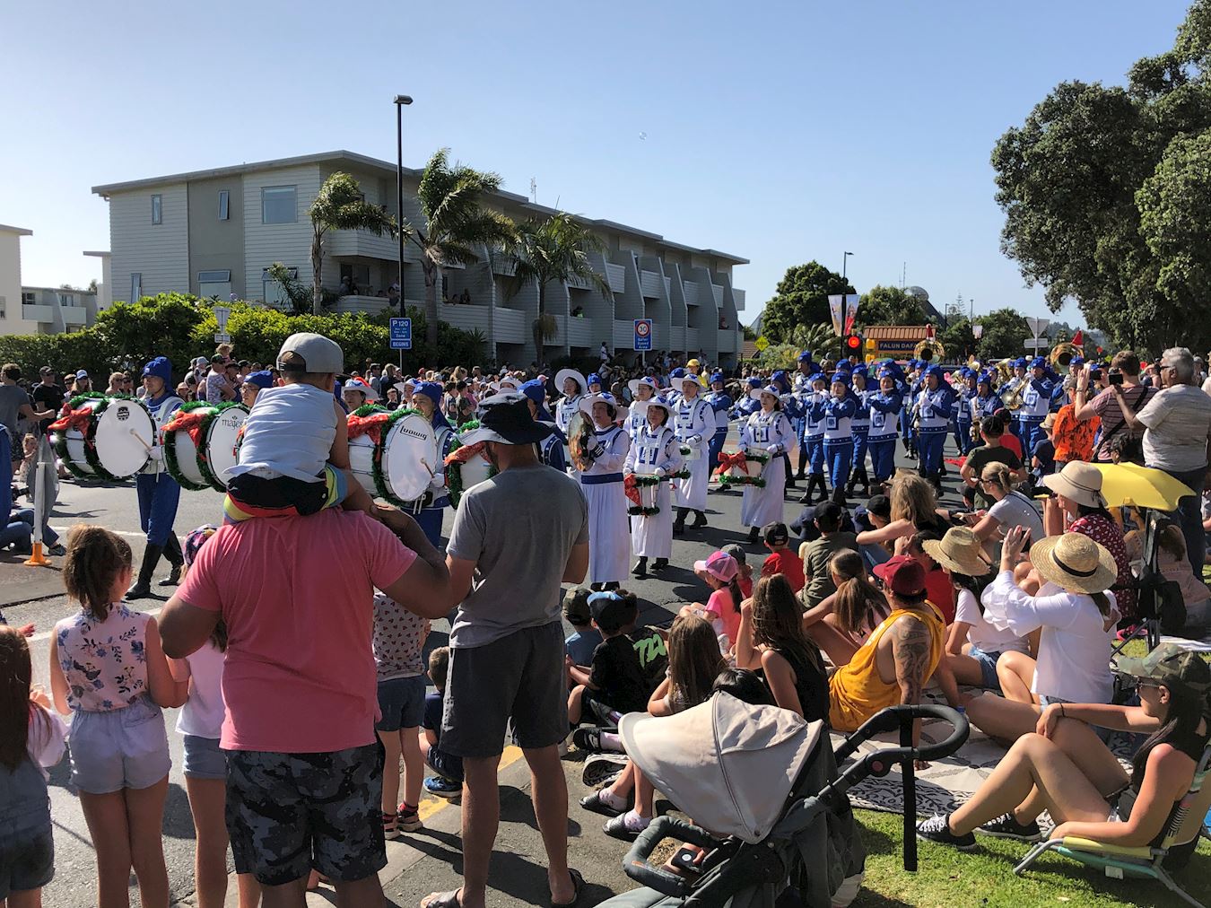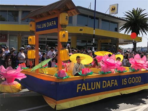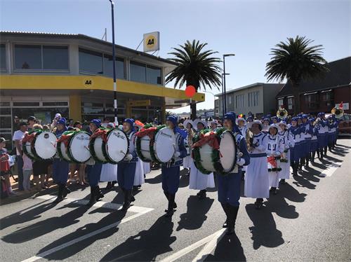 游行的当天,天气晴朗,下午时分,游行路线两边已经挤满了翘首企盼的人们。只见法轮功学员组成的天国乐团,身着蓝白相间的古典服饰,迈着整齐的步伐,演奏着雄壮、欢快的乐曲,让人们顿时眼前一亮。当乐团和花车经过时,人们报以热情的掌声欢迎,他们随着乐曲的节奏挥舞着双臂,有的华人录像拍照,喊道:“快看,法轮功!”