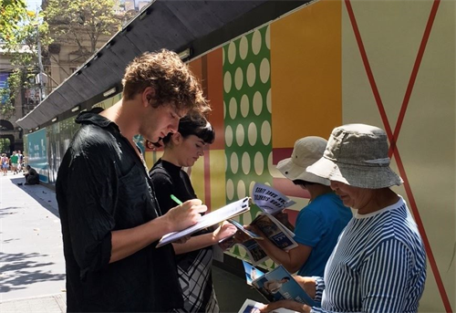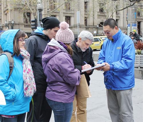 法轮功学员马克(Marc)在过去四年间坚持每周两三天在墨尔本的市中心征集联署举报迫害元凶的签名。他说:“这些年中我遇到来自各个阶层的各种各样的人们,当他们得知在中国发生的迫害真相时,都非常震惊,他们很多人对共产主义的实质几乎一无所知,比如强制洗脑和对人民非常残酷等等,所以当我们交谈之后,我列举的事实让他们警醒,才知道中国发生着什么。”