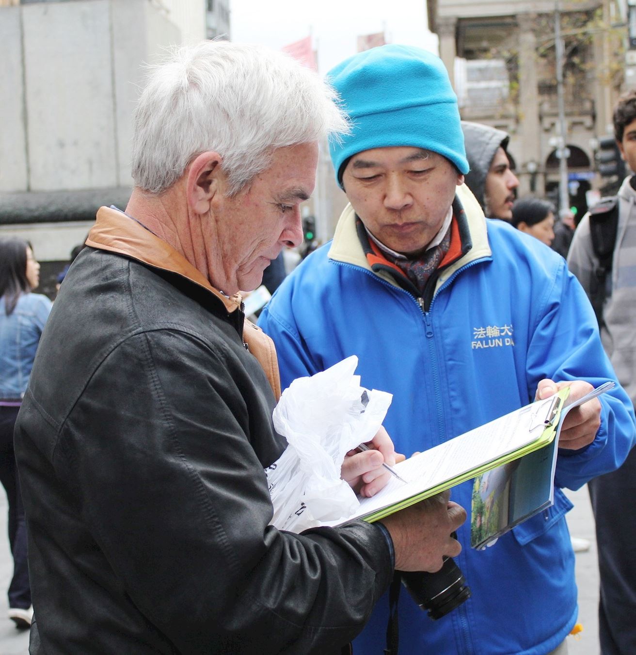 ![]() 图8:墨尔本法轮功学员马克(Marc,右)在征签。 |