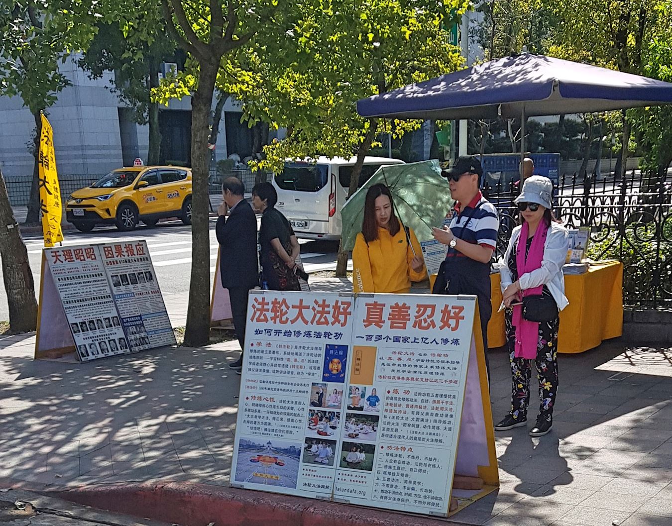 一位女士带着年迈的父母亲经过展板时,父母亲停在“天安门自焚”伪案真相展板前仔细观看。学员向前询问,中年妇女在一旁表示:“来了台湾好些天,都看到了你们这些展板,但我在(中国)国内就了解了。国内也有你们法轮功公开宣扬喔,我在公园就遇到过。在公园算是公开了吧?这些事我都知道,所以我带老人们出来都不阻挡他们看。”临行前,老太太还拿了一本真相资料带回去慢慢看。