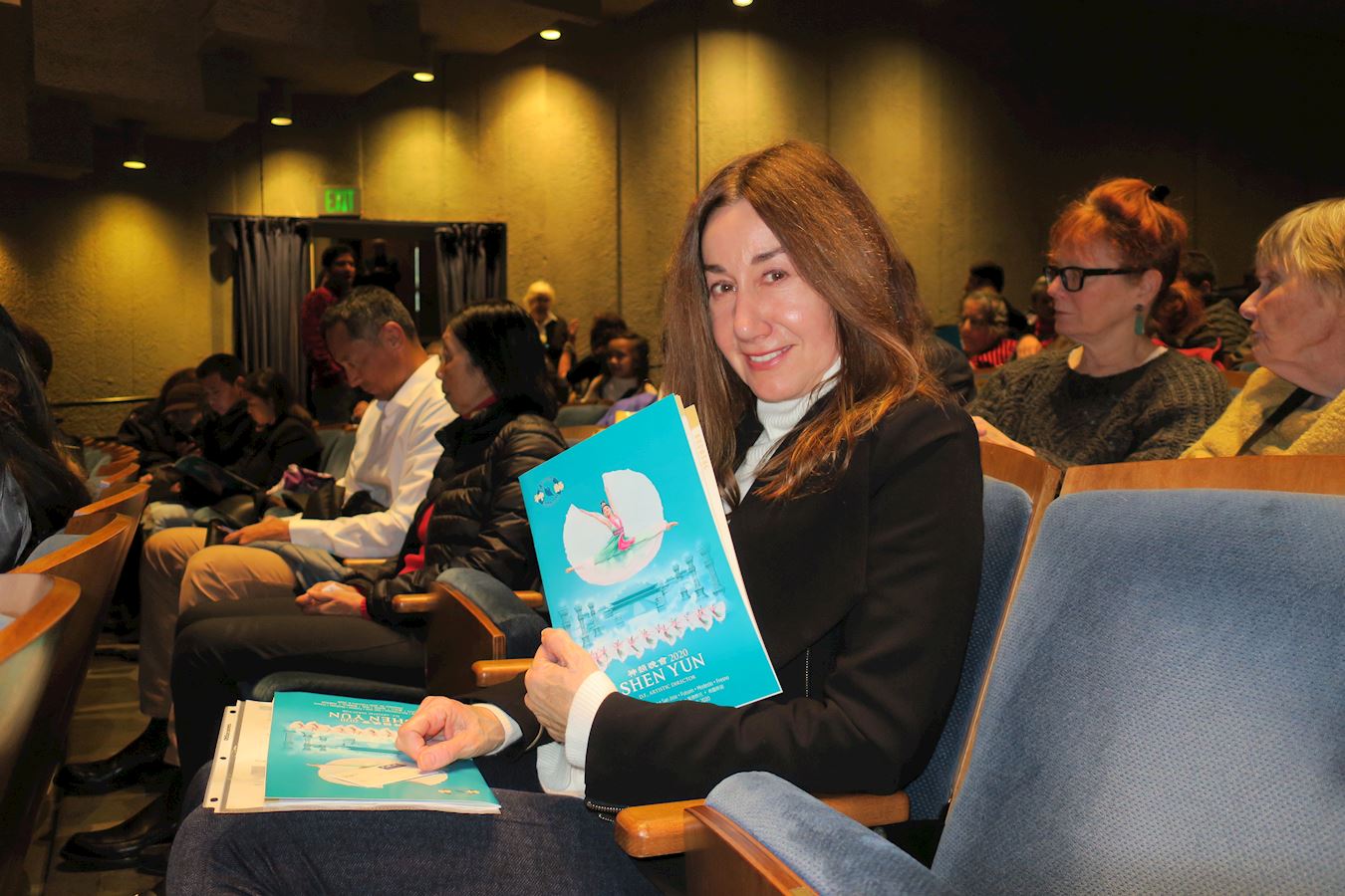 ![]() 图4:二零一九年十二月二十二日下午,加州大学伯克利分校教授安娜·贝莱扎(Anna Bellezza),观赏了神韵环球艺术团在加州大学伯克利分校泽勒巴克馆的演出。 |