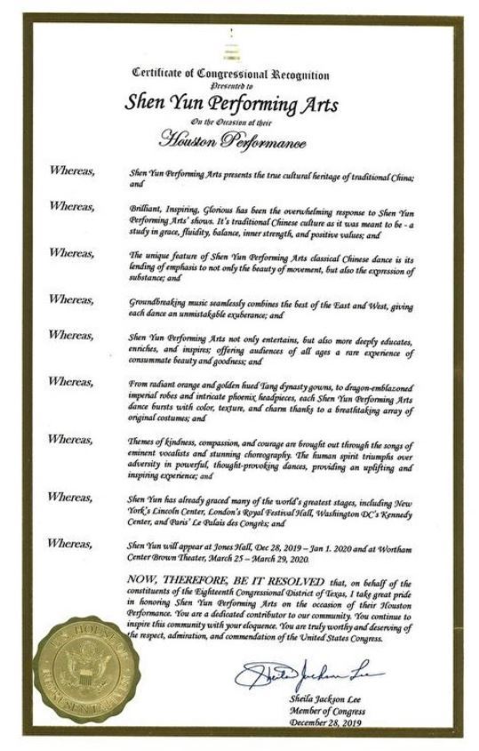 美国联邦众议会议员希拉·杰克逊·李(Sheila Jackson Lee)在信中赞扬神韵艺术代表了真正的传统中国的文化遗产。她代表德克萨斯州第十八届国会选区的选民,为神韵演艺的休斯敦演出而感到自豪。她赞扬促成神韵在休斯顿演出的主办方是社区贡献者,值得美国国会给予重视,钦佩和赞扬。