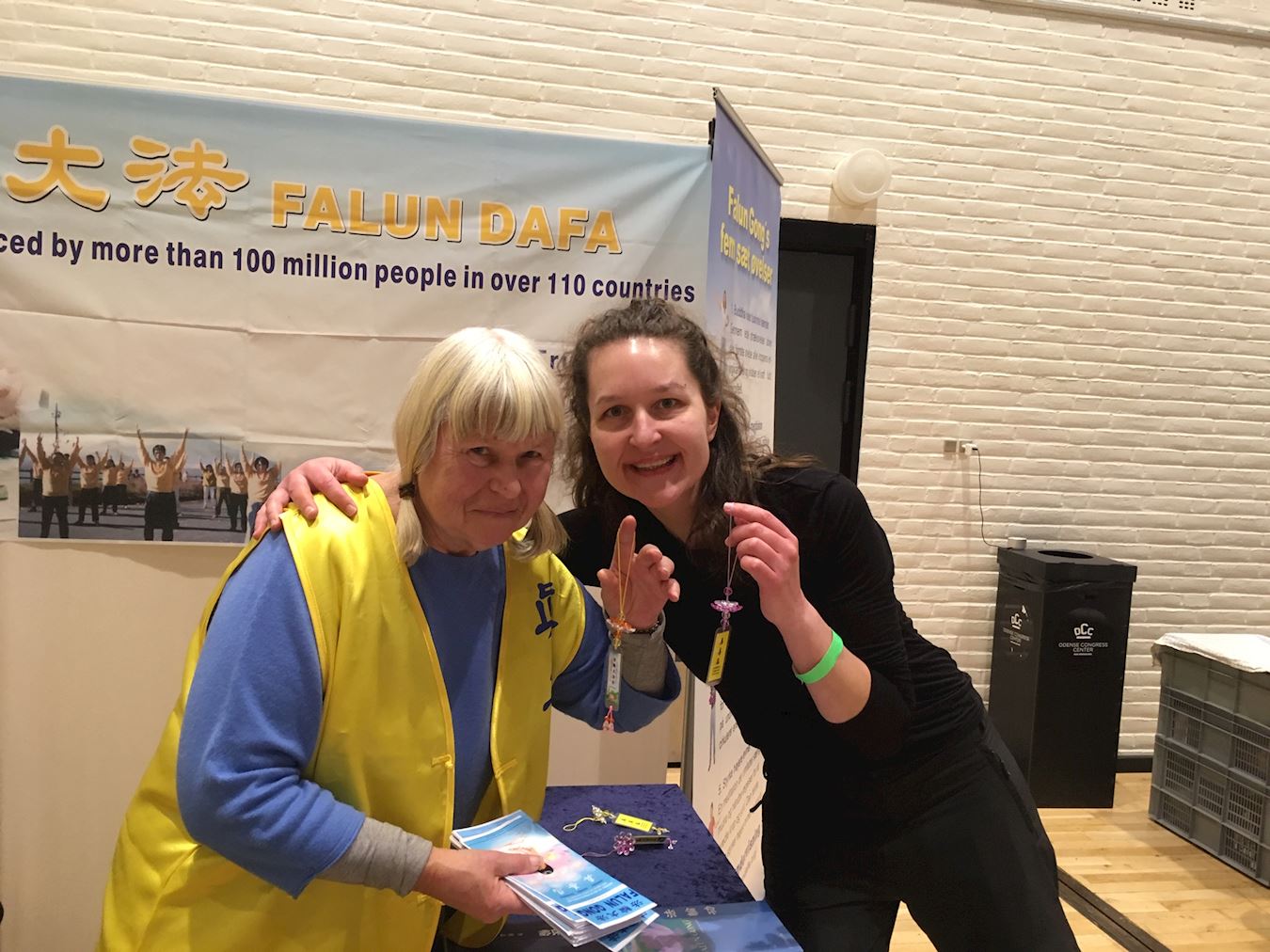 米尔(Mie Lykke)曾经坐轮椅车,刚能正常行走三个月,她一直在寻找有益身心健康的方法。米尔说:“我一直很乐观,相信有神灵帮助,感觉每天都有好事情。”“今天我很幸运碰到法轮功,又是一件好事情。”她和学员一会儿用丹麦语,一会儿用德语交谈,高兴地表示要学炼法轮功。