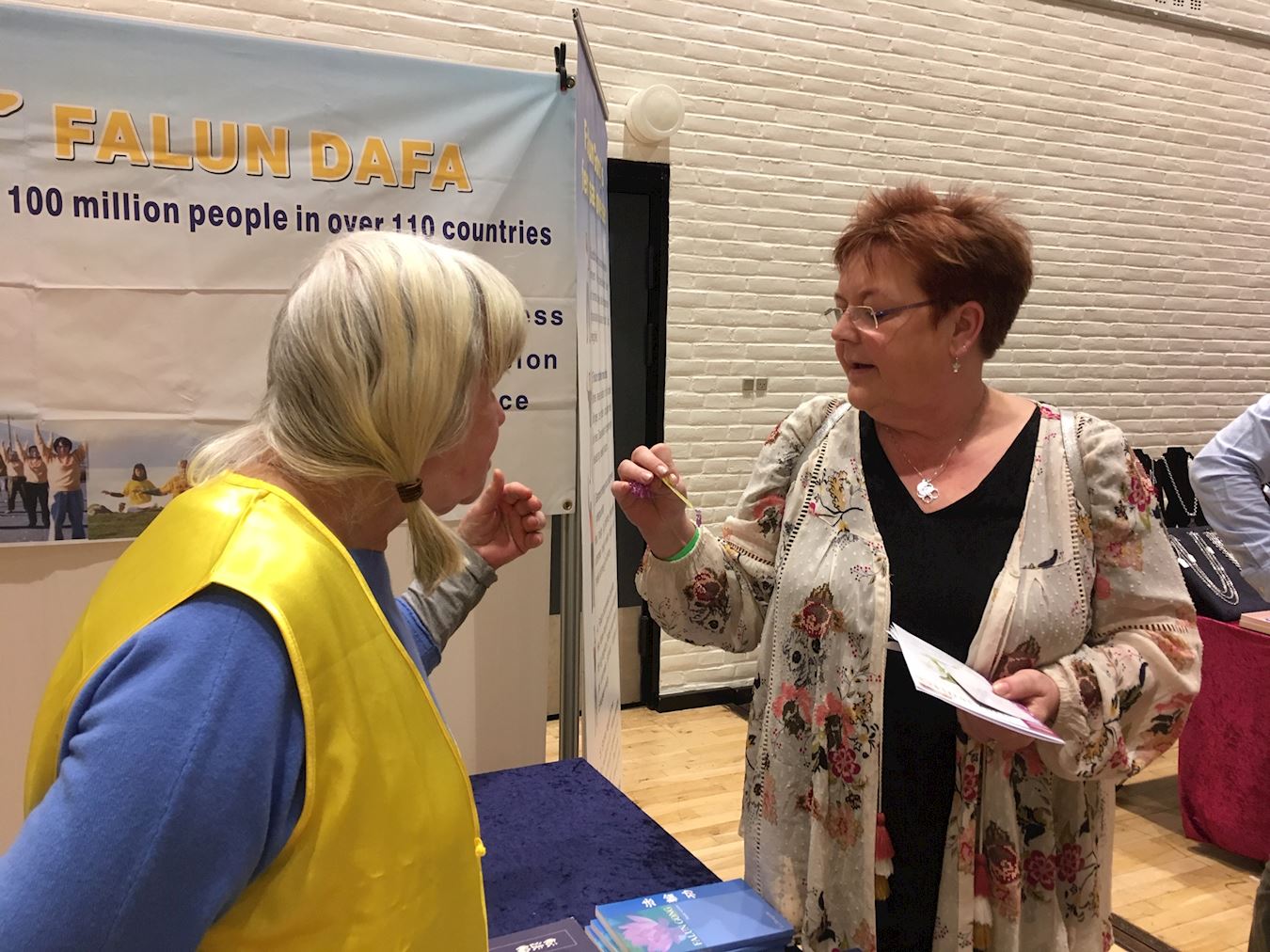 很多人走过法轮功展位时都感觉能量场强,两位女士静静地观看学员炼功。看着看着,其中一位问她的同伴:“感觉到能量强吗?”另一位说:“我感觉很纯净。”