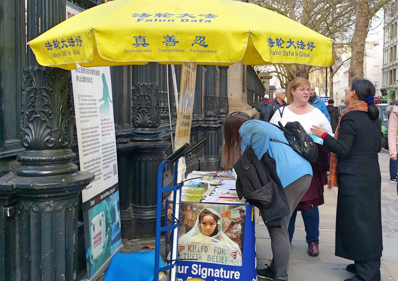 当天下午,一位在中国大陆工作的台湾女子在大英博物馆前与一位法轮功学员交谈后改变了对法轮功的看法,随后她签名支持法轮功学员反迫害。她说自己知道台湾有很多人炼法轮功,但她以前有些回避法轮功,觉得对她来说太神(spiritual)了,对法轮功的反迫害活动她也没有认真思考过。现在她认识到法轮功打坐修行是对人很有益的生活方式,中共迫害法轮功是在加害无辜,世界各地的法轮功学员要求停止迫害是义举,应该得到支持。她说:“我认为在这里讲真相是很重要的,应该让更多人了解(法轮功学员的正当反迫害诉求),这么多人(因为信仰)在受苦受迫害,不该这样。”临走时她鼓励法轮功学员“加油”。