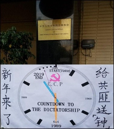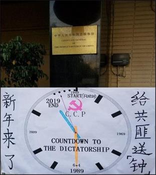 【明慧网二零一九年二月九日】二月四日除夕新年钟声将要敲响之际,原大陆维权律师刘士辉等数人,却冒着罕见的大雨,齐聚中共驻洛杉矶总领事馆门前,为中共暴政送上了一份意味深长的节日大礼:一口精心制作的“独裁倒计时钟”。