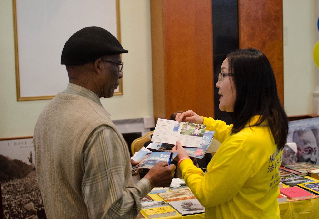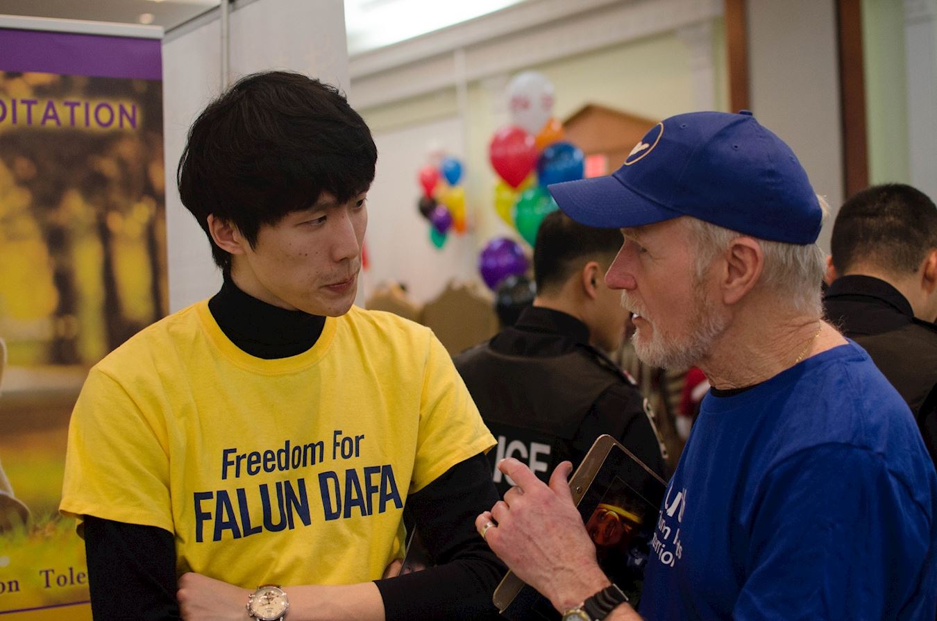 一位华裔男士来到法轮功的展位前,告诉学员他在很多地方都看到听到法轮功。法轮功学员告诉他法轮功不仅在祛病健身方面有着神奇的效果,还提高人的道德水平,法轮功学员也遍及世界一百多个国家和地区。在交谈了二十多分钟后,他感谢学员的介绍并拿走了法轮功的介绍传单,回去后要更多的了解法轮功。