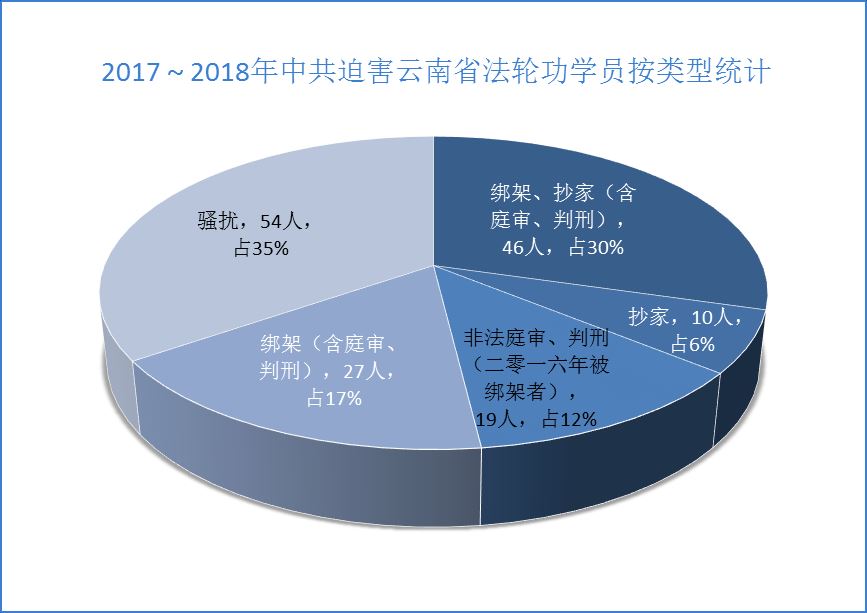 ![]() 图1:2017~2018年中共迫害云南省法轮功学员按类型统计 |