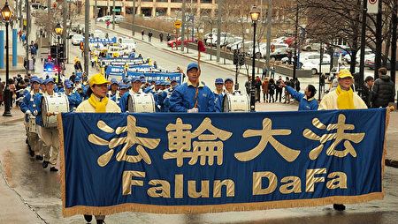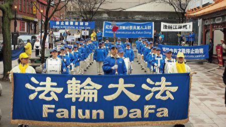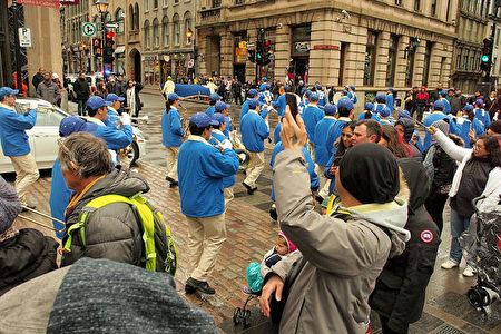 集会后举行了游行活动。由天国乐团、由西人学员组成的炼功方阵和横幅方阵组成的队伍, 沿着唐人街和蒙特利尔知名景点老城区行进,所到之处民众纷纷接过法轮功学员递上的真相传单。
