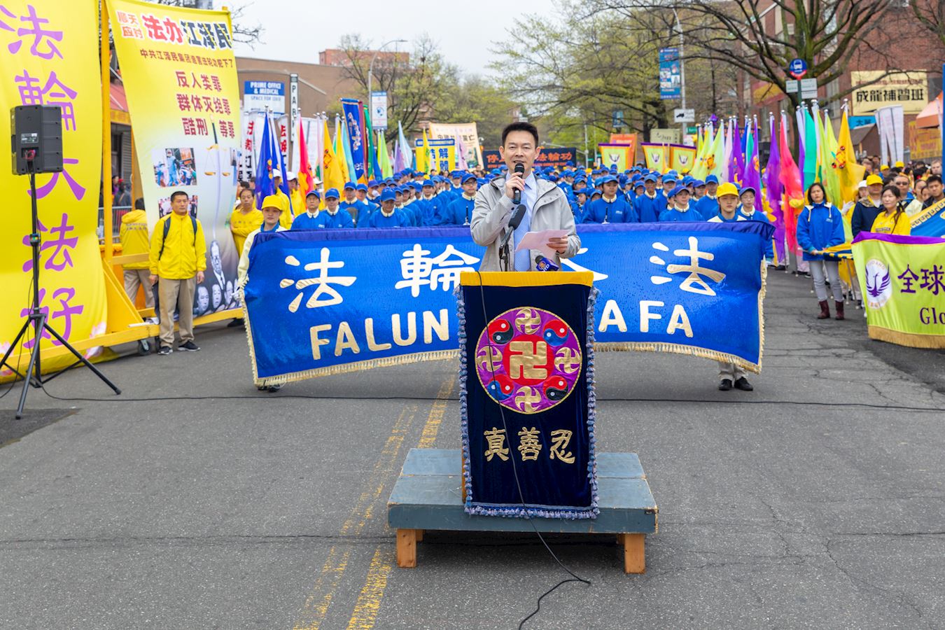 【明慧网二零一九年四月二十三日】二零一九年四月二十日下午一点多钟,上千名纽约法轮功学员和法轮功的支持者,在游行终点处――凯辛娜大道上的法拉盛图书馆旁举行盛大集会,纪念一九九九年四月二十五日万名法轮功学员和平上访二十周年,声援三亿三千多万中国人退出中共的党、团、队组织,并呼吁世界各国政府和广大民众,共同制止中共对中国人的迫害,警惕和制裁中共对海外自由社会的渗透、破坏。