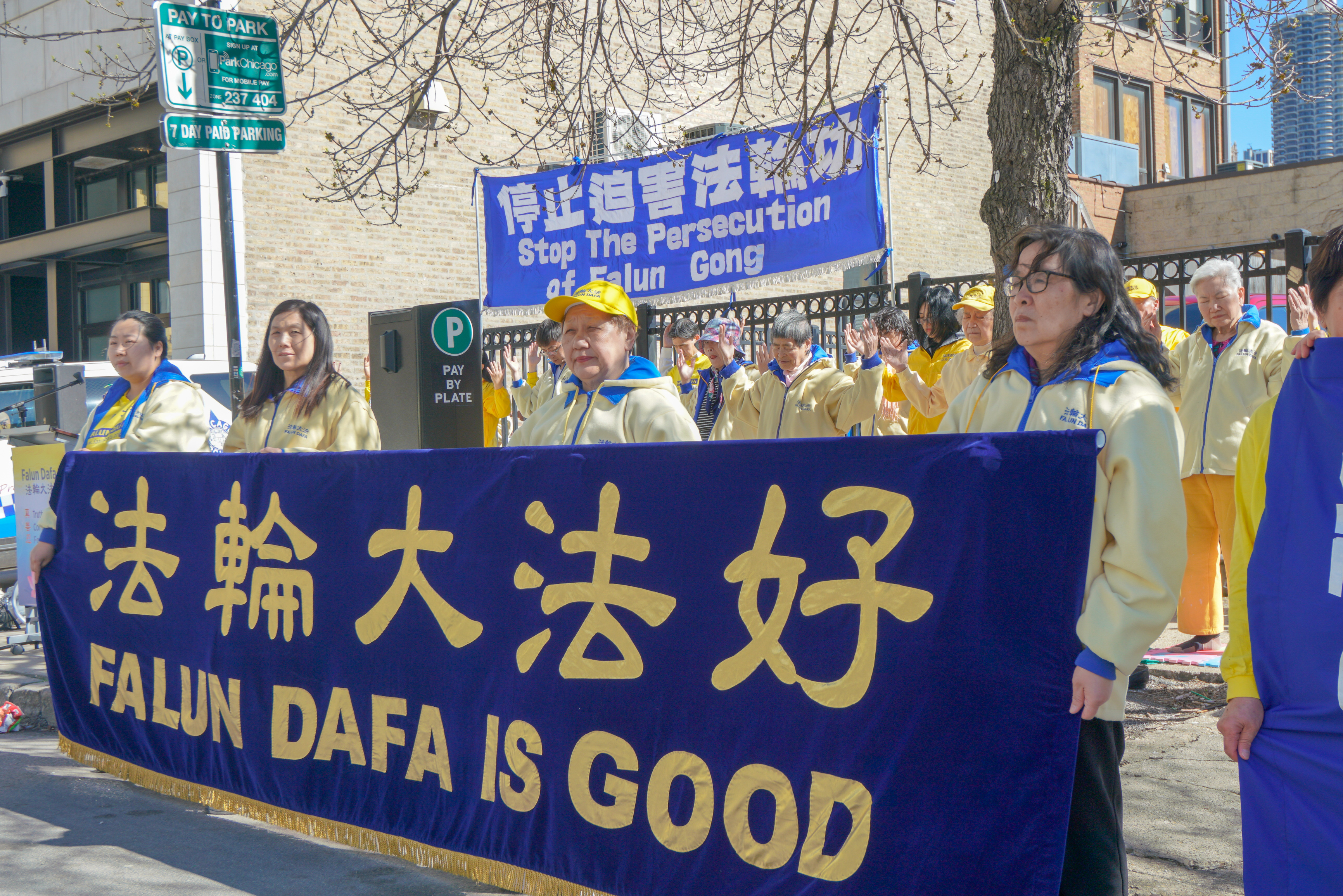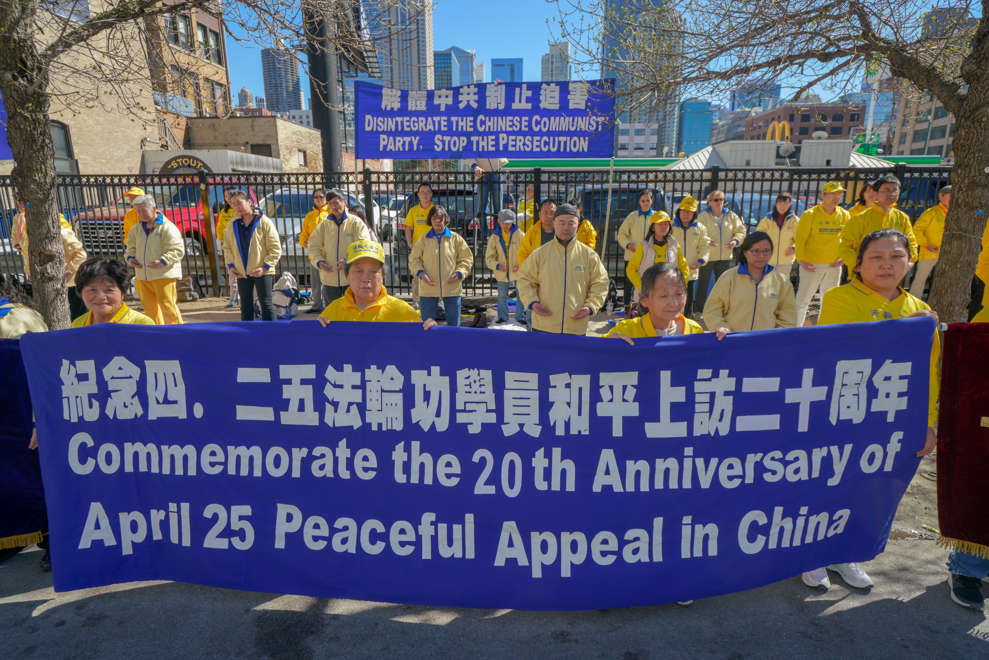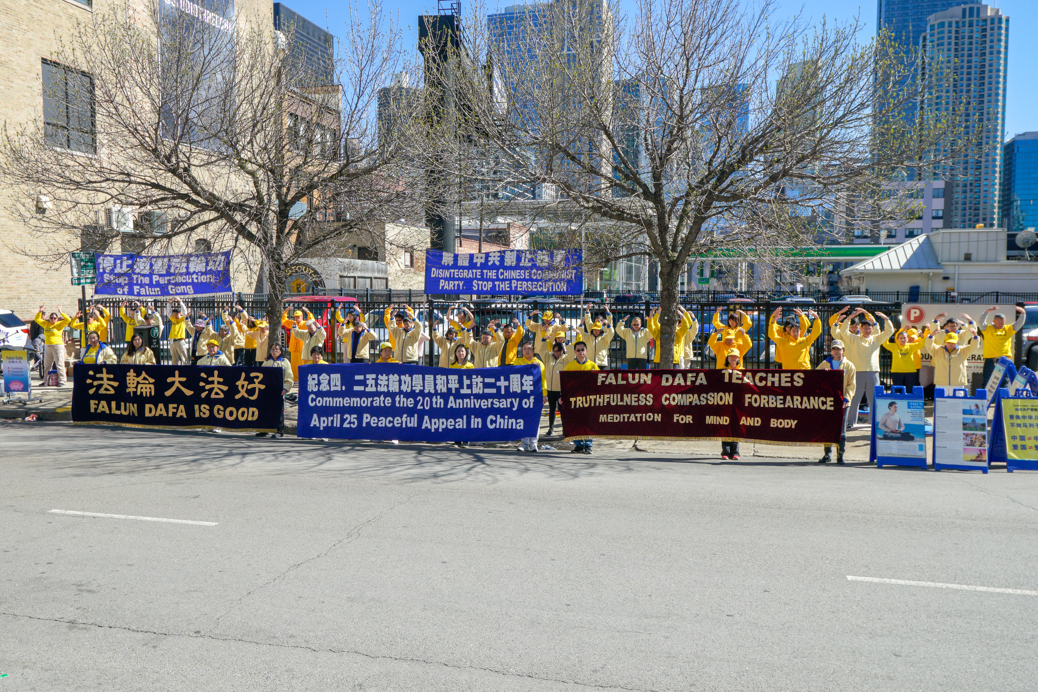 【明慧网二零一九年四月二十三日】二零一九年四月二十日,美国芝加哥法轮功学员在中领馆前集会,炼功,纪念“四·二五”法轮功学员万人和平上访二十周年。