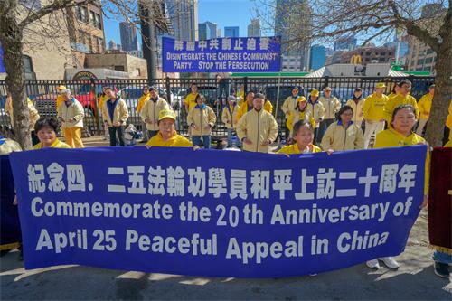 图1~3:芝加哥法轮功学员在中领馆前集会,纪念“四·二五”万人和平上访二十周年。