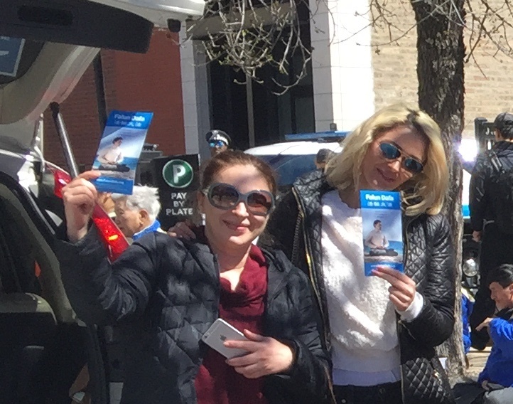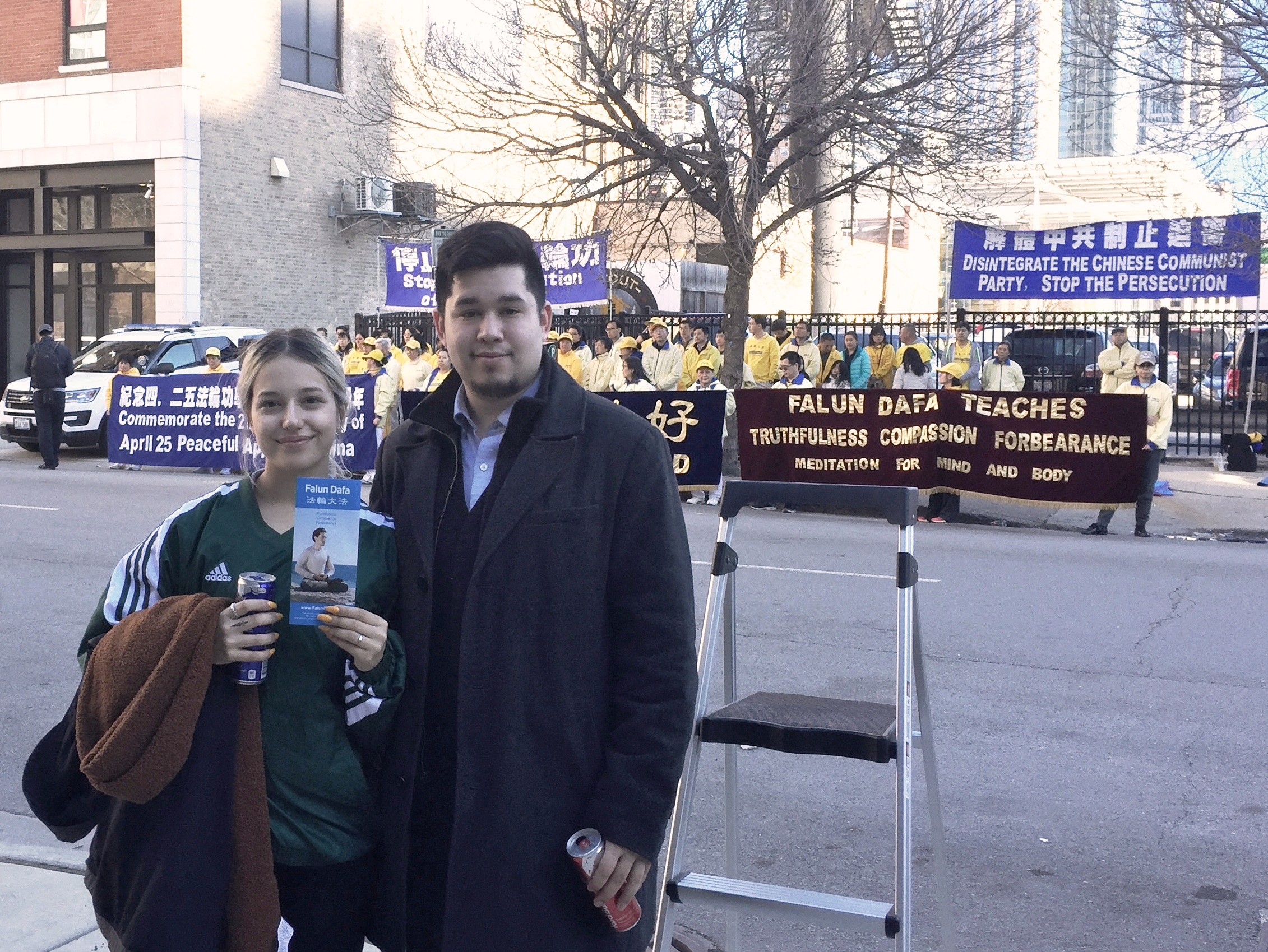在附近上班的芝加哥居民Destiney 和Alfredo,一边观看学员炼功,一边拿出手机马上上网查询。当学员走到他们面前要讲真相时,他们说:我都知道了,我刚刚在网上都看到了。他们表达了对法轮大法“真善忍”原则的认同和赞誉。