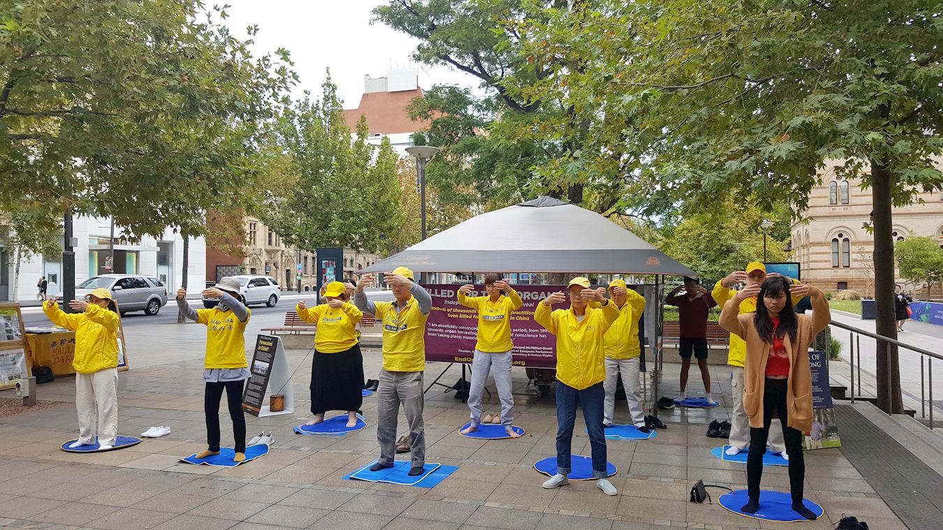 ![]() 图1~2:二零一九年四月二十一日,南澳部份法轮功学员在首府阿德莱德的文化商业中心北大街的亨利王子街心花园集体炼功,传播法轮功真相。 |
