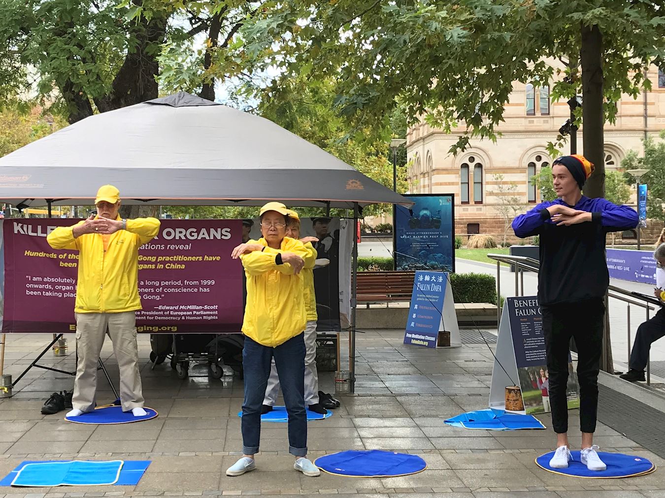 一位叫本(Ben)的青年看到学员在炼功,也加入其中跟着学员学炼功动作,他说感觉很好,要继续了解更多。当得知这么祥和向善的修炼人在中国却不能自由学炼,并受到打压甚至失去生命,他表示一定要制止这迫害,他还叫上两名同伴一起在制止迫害请愿表上签名。