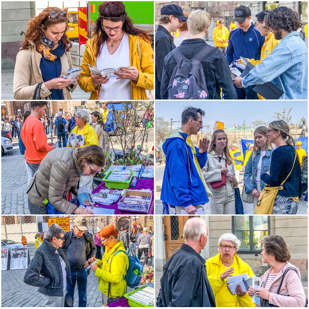 下午两点,法轮功学员们又来到斯德哥尔摩市中心皇宫旁最热闹的钱币广场上,继续向当地民众和过往路人讲述法轮功真相,呼吁瑞典民众都来支持正义、帮助停止迫害。