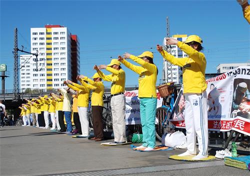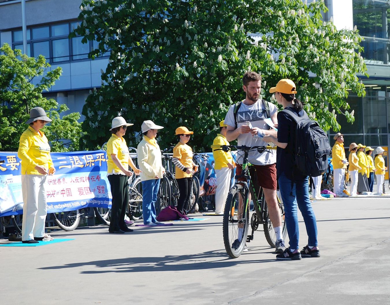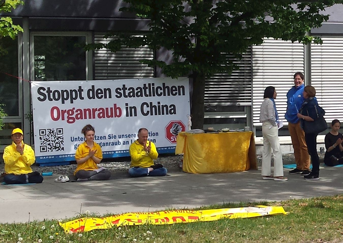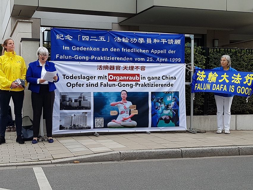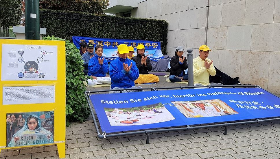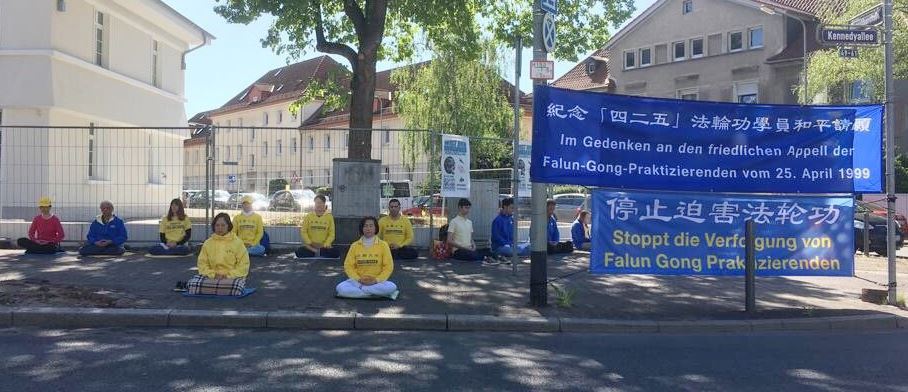 学员们上午九点钟聚集在杜赛尔多夫的中领馆对面,架起了纪念四·二五和平请愿和谴责中共活摘器官的大型展牌。那时领馆前有许多人正在排队等着进领馆办事,其中大部份是中国人。他们默默看着法轮功学员们搭展牌,发正念,演示功法。集会时,不时有当地居民经过。他们中有不少人主动停下来,向学员了解迫害真相。
