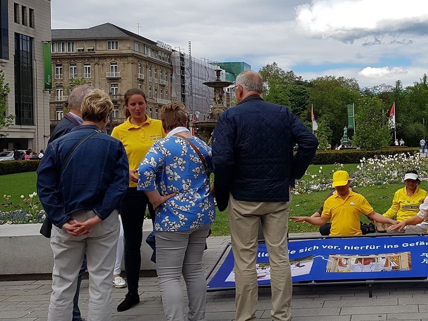 当天下午,学员们又在当地著名商业街“国王大道“(Königsallee)边的科尼利维斯广场(Corneliusplatz)搭起了真相点。一位大约八十岁左右的现执政党之一的基民盟(CDU)成员对中共的迫害表示很震惊。她对学员说,她觉得人的价值观下滑的很厉害。法轮功学员有这么高尚的价值观,却因此而被迫害,这让她感到震惊和痛心。