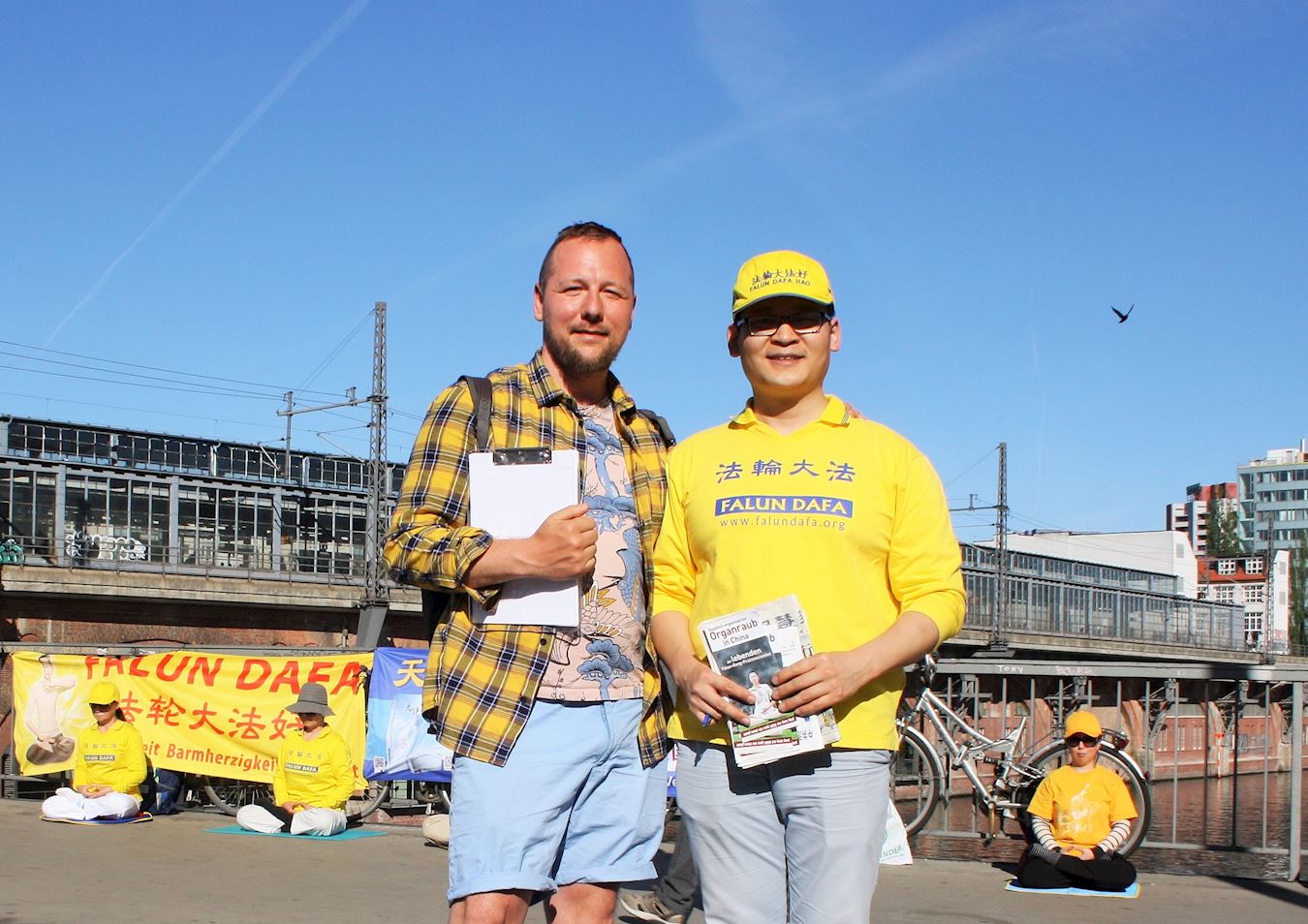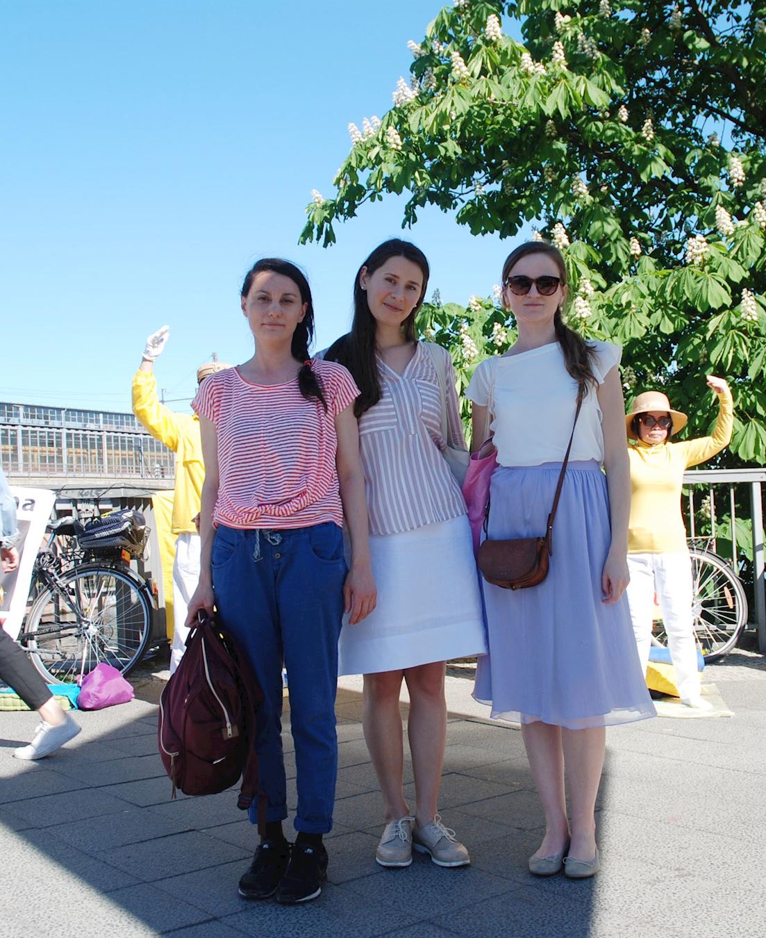 汉堡学员莉阿娜(Liane) 说:“法轮功学员都是好人,为什么要被迫害。不是在那(九九年)之前的七年中,(中国)政府都是正面的态度吗?法轮功不是多次被褒奖吗?在中国大陆以外没有哪个政府和国家对法轮功学员害怕和关押,恰恰相反,他们因为善良和对自己有很高的道德标准而被当地民众乐于接受。我来中领馆前是想让大家了解中共是如何对待信仰真善忍的好人的,也希望引起大家对在大陆受迫害的法轮功学员的关注。”