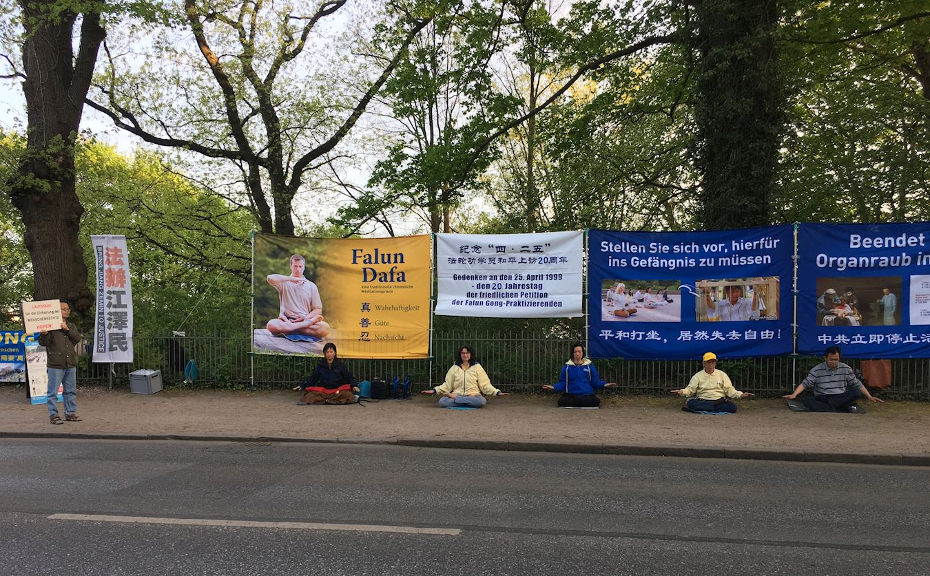 四月二十五日,汉堡法轮功学员在中领馆前连续二十小时静坐抗议。中午到下午,来往车辆很多,天气十分晴朗,因而路人和来往自行车也多。很多人经过时向法轮功学员点头打招呼,竖大拇指鼓励,按喇叭表示支持。不少人说他们在中领馆前看到过学员的抗议。