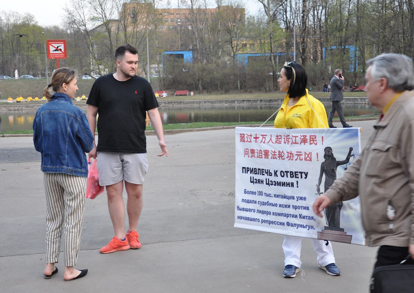 斯维塔·帕鲁尼娜(Sveta Polunina)女士手举“问责迫害元凶江泽民”的展板,她说:“江泽民及其同伙发起并持续了近二十年的迫害。迫害的原因是在极权主义政权下掌权的人的独断专行、无法无天和认为自己将不受制裁的狂妄。在我们国家,俄罗斯人都知道这种行为的模式,例如,斯大林和他(发动)的迫害。几乎每个俄罗斯人都会真诚地为迫害感到难过和对无辜被迫害的中国法轮功学员表示支持。”