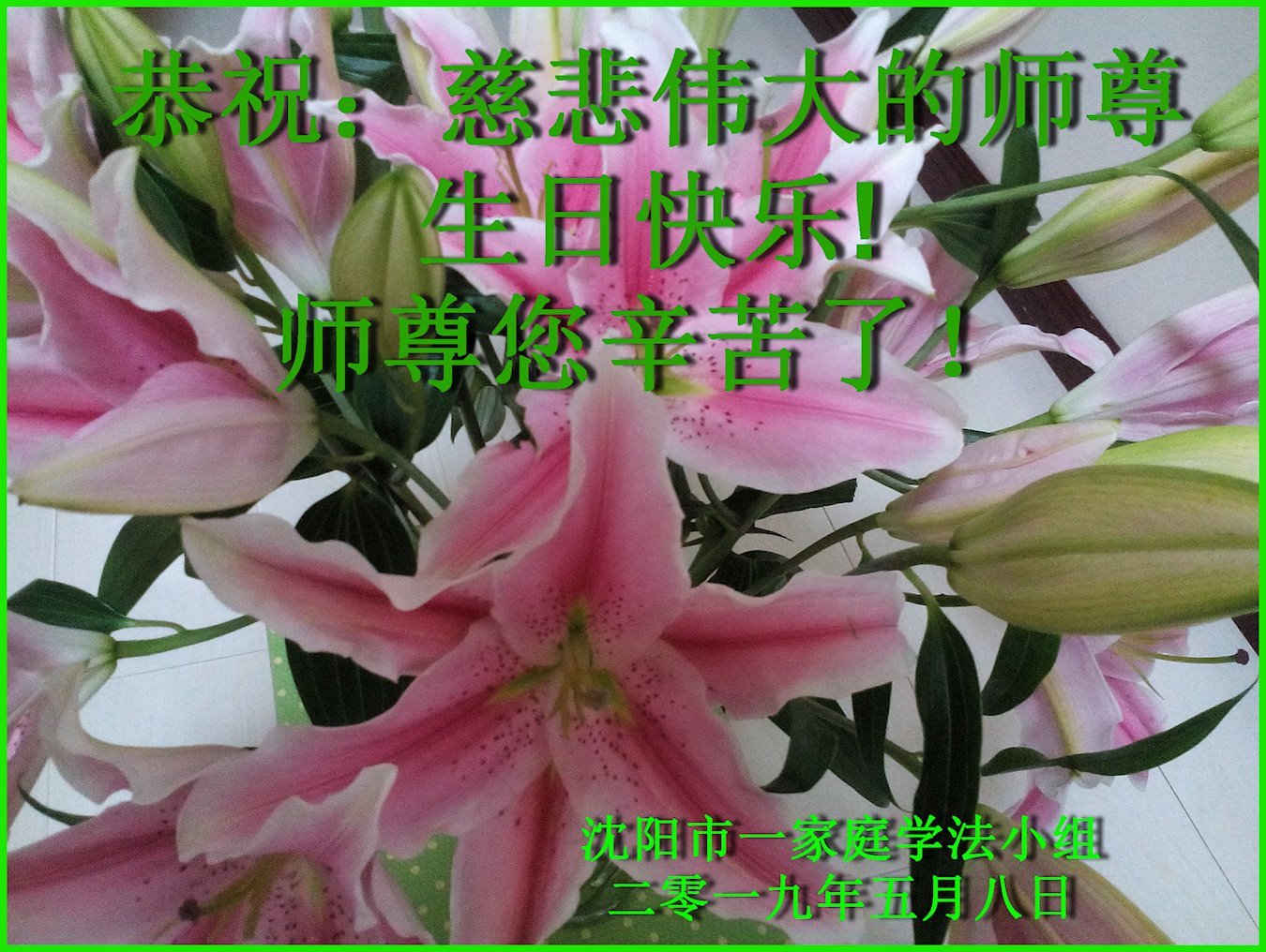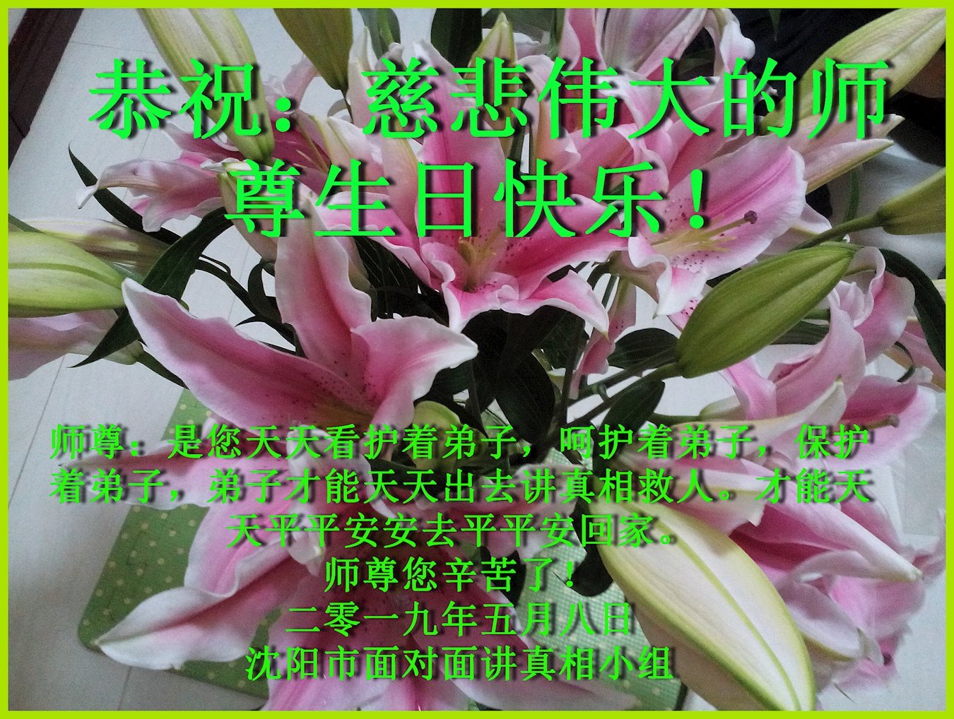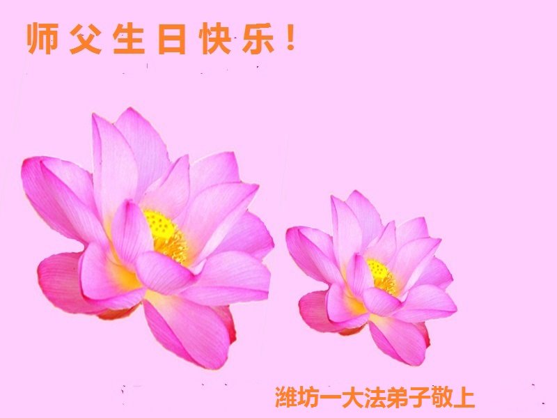 我和新得法二年的英姐,祝师父生日快乐!英姐说:师父太慈悲了,她真切的感受到了,师父给她调整身体。我俩感谢师父的救度之恩!