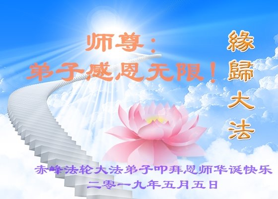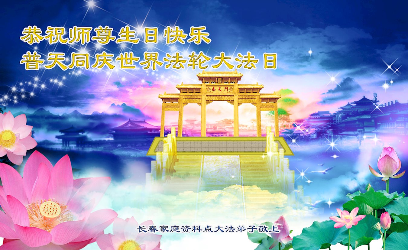 在世界法轮大法日到来之际,弟子向您保证一定精進实修,不负师尊的慈悲苦度。我会处处事事以真、善、忍归正自己,圆满随师还。