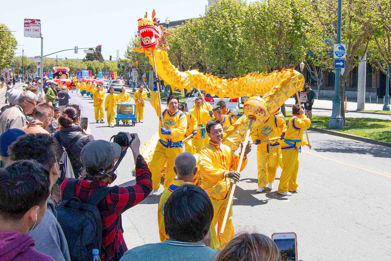 上午十二点,庆祝游行开始。游行队伍由阵容庞大的天国乐团前导,随后是舞龙队,接着是拿着各种横幅的队伍,上面写着:“世界法轮大法日”、“法轮大法好”等,炼功队伍展示祥和五套功法。还有花车、小花船、唐鼓队及腰鼓队等,浩浩荡荡。