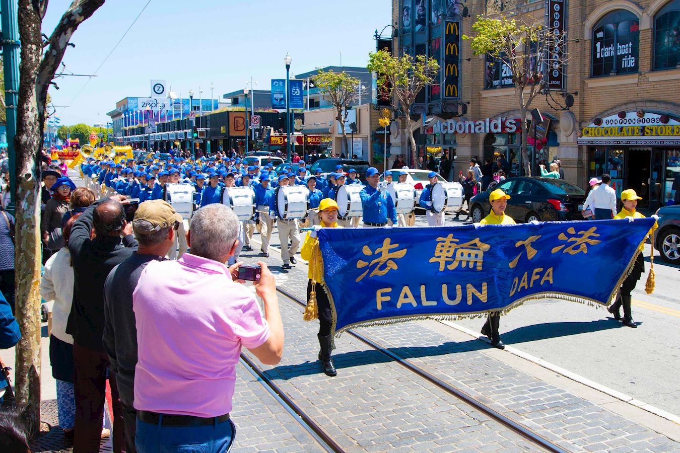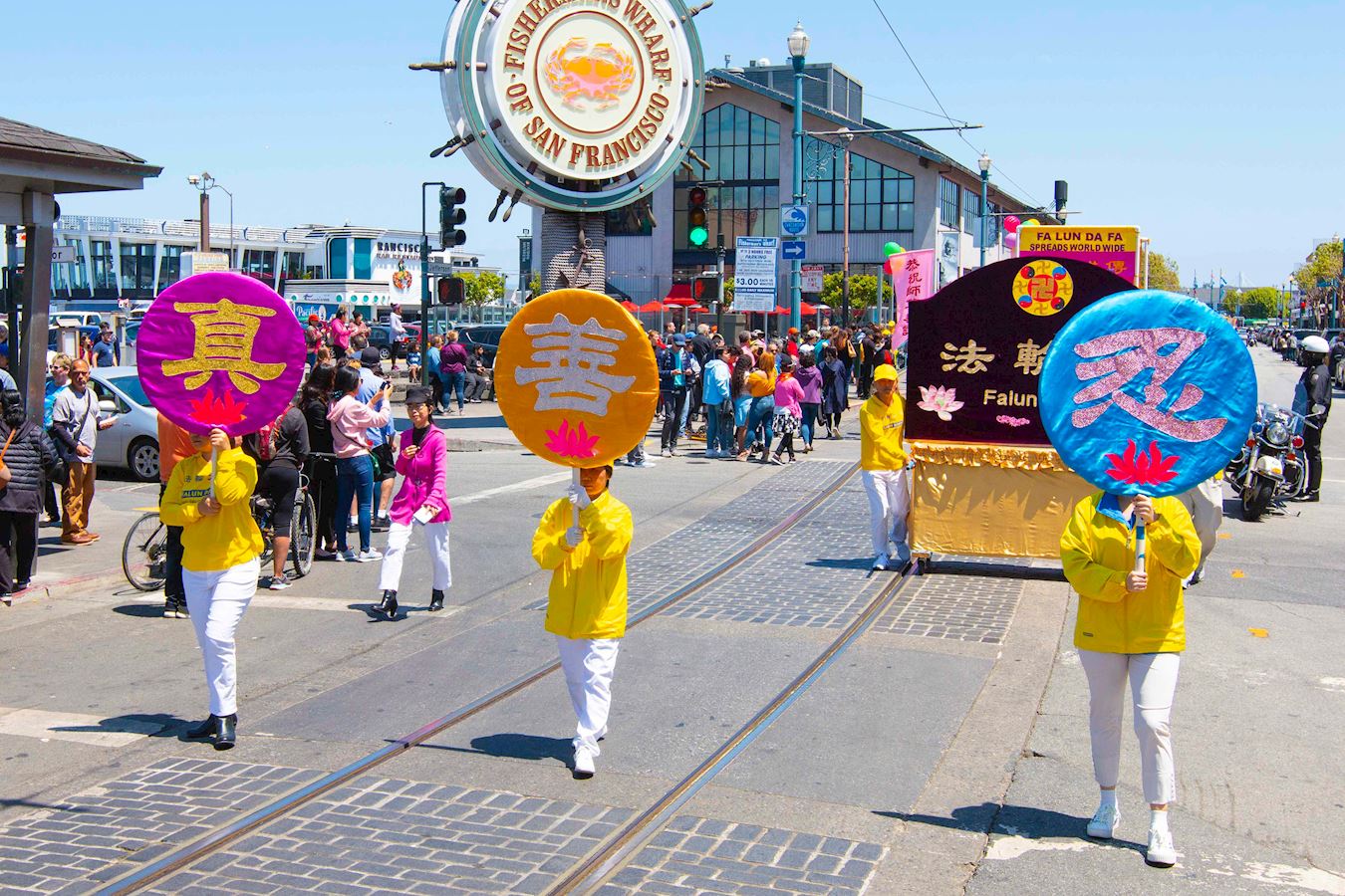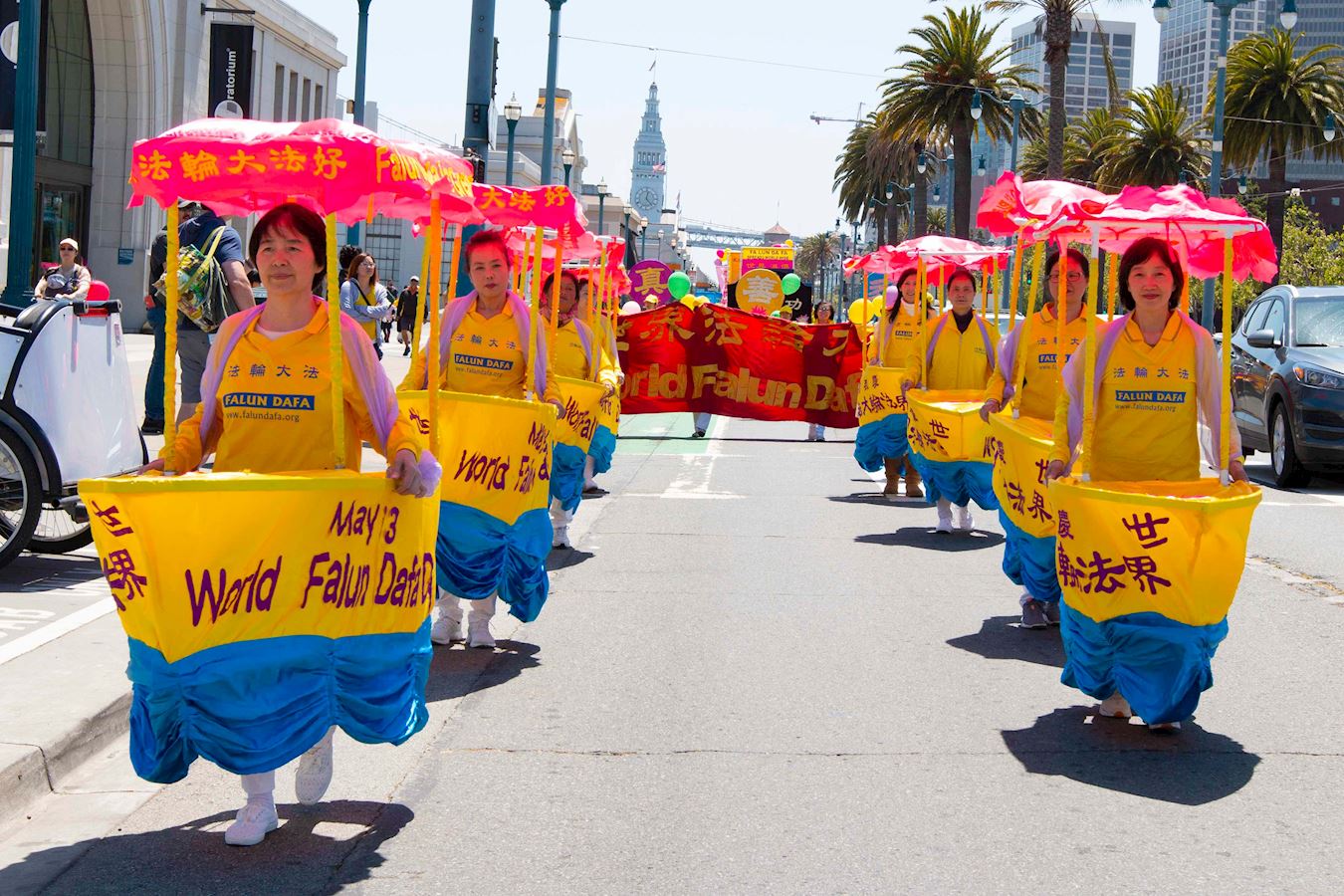 星期六上午九点,法轮功学员首先在旧金山渡轮大厦(Ferry Building)集体炼功,展示祥和优美的功法,庆祝法轮大法日。许多游客被吸引,了解什么是法轮功。还有的人看到这么祥和的炼功场面,主动要求学炼法轮功。
