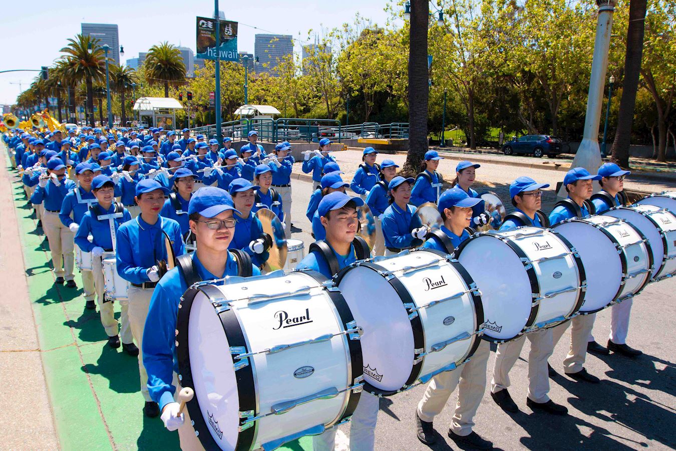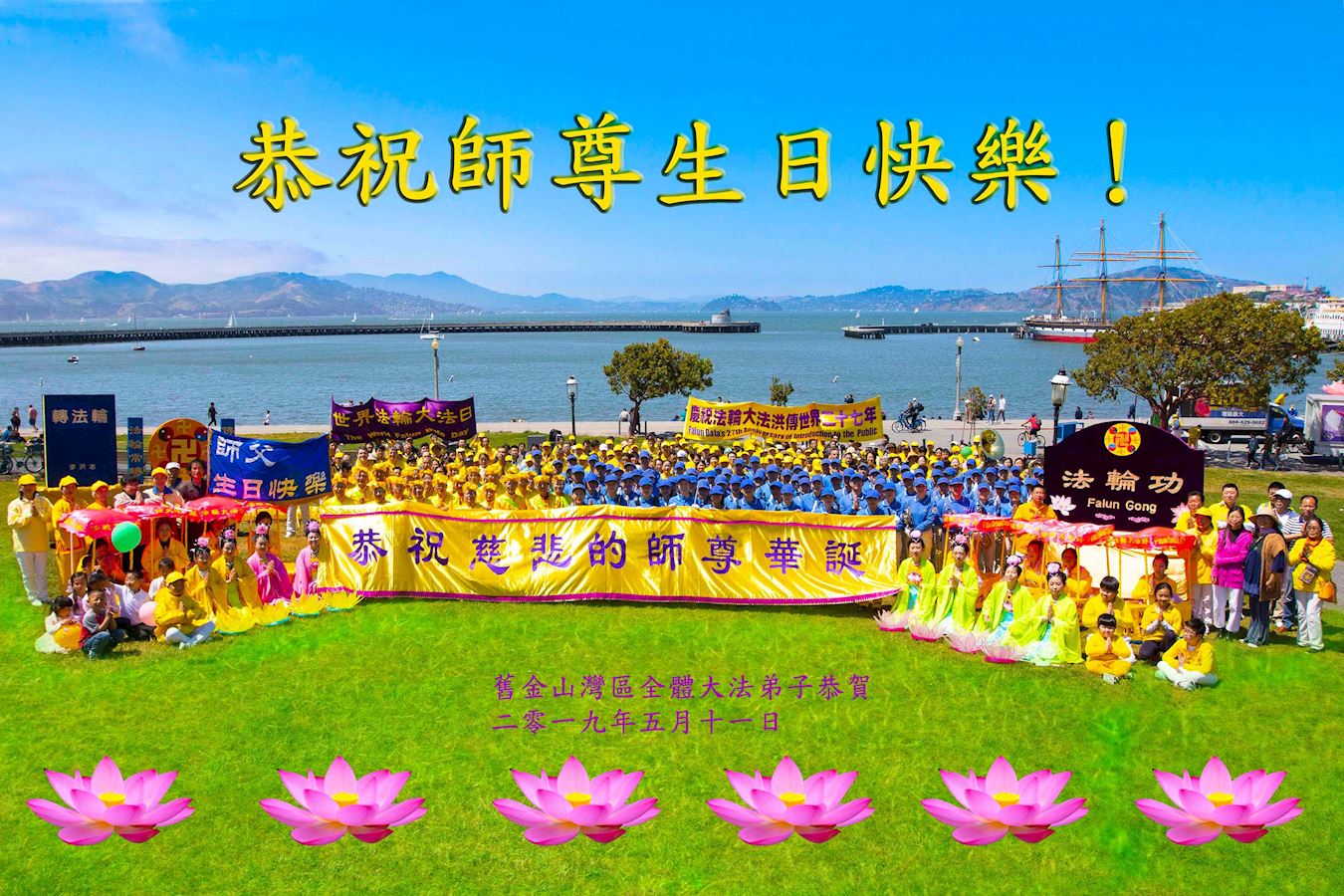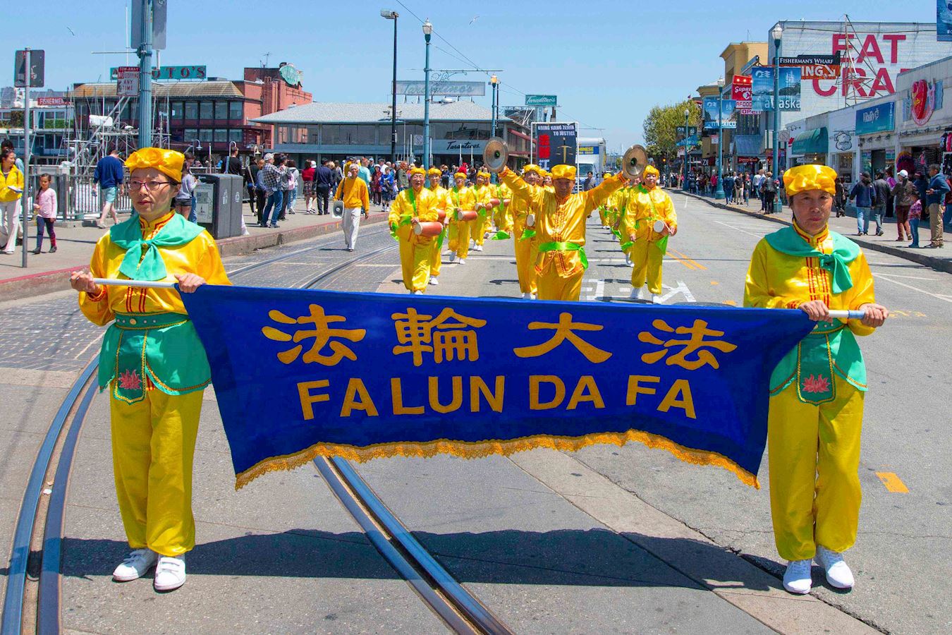 星期六上午九点,法轮功学员首先在旧金山渡轮大厦(Ferry Building)集体炼功,展示祥和优美的功法,庆祝法轮大法日。许多游客被吸引,了解什么是法轮功。还有的人看到这么祥和的炼功场面,主动要求学炼法轮功。