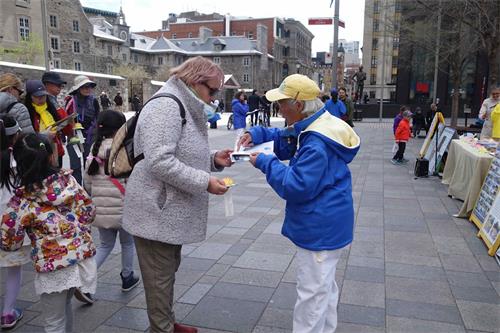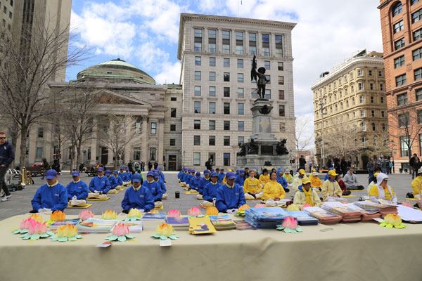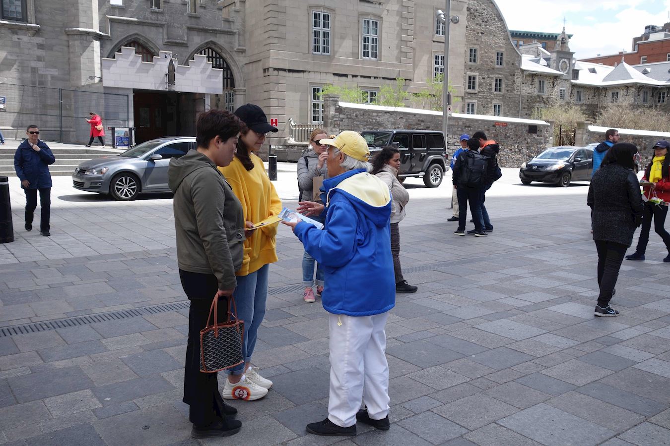 ![]() 图1:5月11日下午,蒙特利尔法轮功学员聚集在老城兵器广场(Place D'arms),以集体炼功、天国乐团演奏和揭露中共迫害的方式,欢庆世界法轮大法日。 |