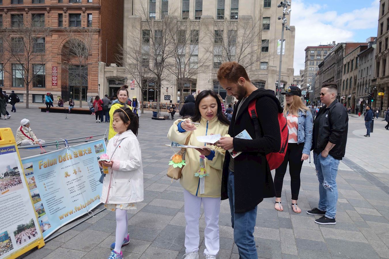 蒙特利尔的兵器广场是知名的旅游景点,汇集着来自世界各地的游客。法轮功学员祥和的活动场面吸引了众多游人来到真相展板前,与法轮功学员交谈,很多人对发生在中国的迫害感到震惊,纷纷在呼吁停止迫害、营救国内法轮功学员的征签表上签名。