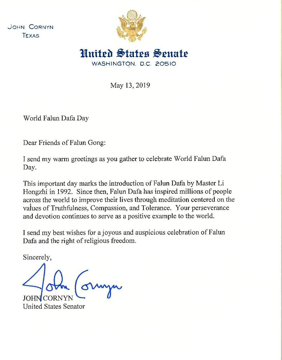 ![]() 图1:美国参议员约翰·科恩(John Cornyn) | ![]() 图2:美国参议员约翰·科恩祝贺世界法轮大法日 |