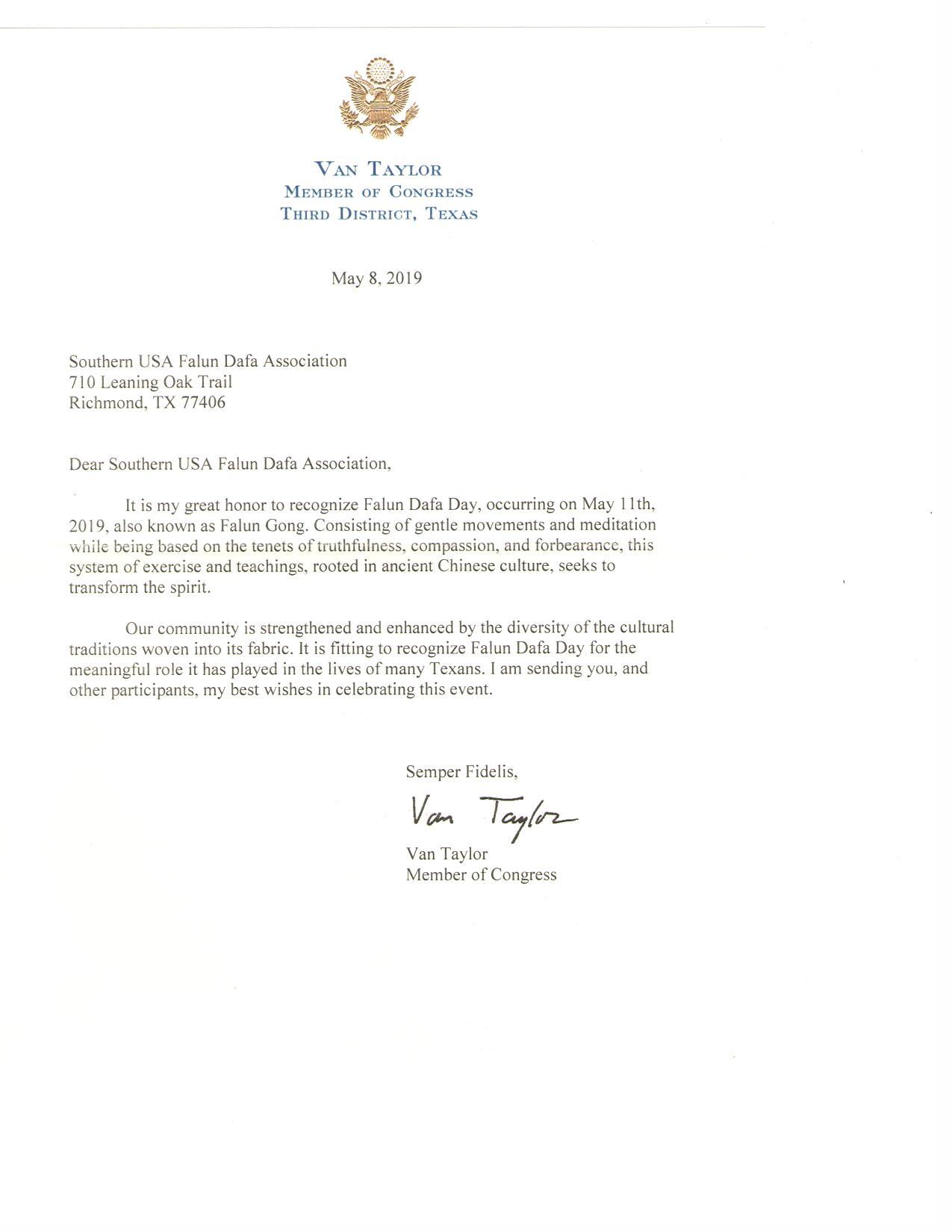 德州联邦众议员万·泰勒的贺信