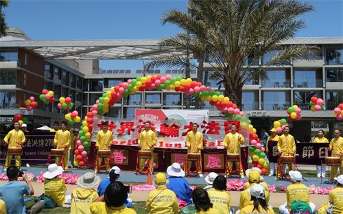 法轮功学员通过功法展示、舞蹈、唐鼓、演唱等文艺表演方式,恭祝师父生日快乐,同时向市民和来自世界各地的游客展示法轮大法的美好。