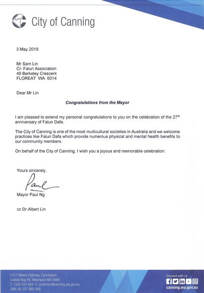 西澳洲(West Australia)坎宁市(City of Canning)市长黄保罗(Paul Ng)以及斯特灵市长欧文(Mark Irwin)分别给西澳法轮大法学会发来贺信和感谢信,祝贺法轮大法洪传二十七周年。