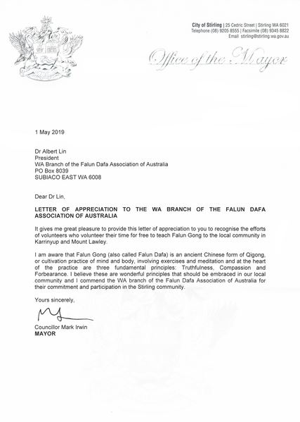 我知道法轮功(又称法轮大法)是一种在中国流传已久的气功,或者是一种包含炼功和静坐的性命双修的修炼法门;而功法的中心思想是真、善、忍这三个基本原则。我相信这些美好的原则在我们的社区应当是被欣然接受的。我在此表彰澳洲法轮大法学会西澳分会在斯特灵市的贡献和参与。