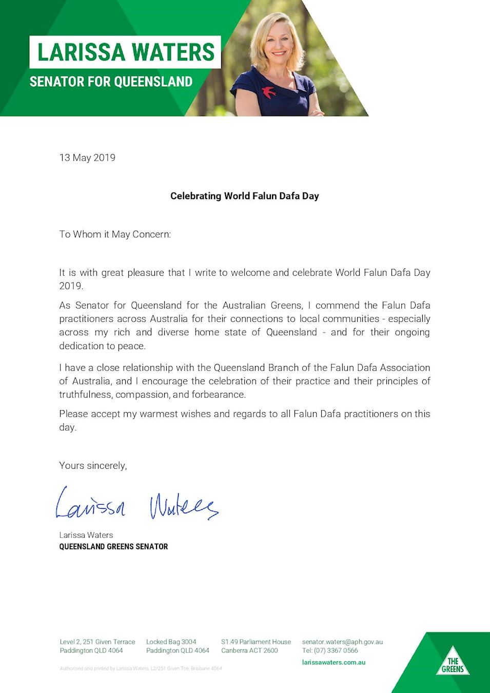 ![]() 图5:昆州绿党联邦参议员华特斯(Larissa Waters)发来贺信,恭贺世界法轮大法日。 |
