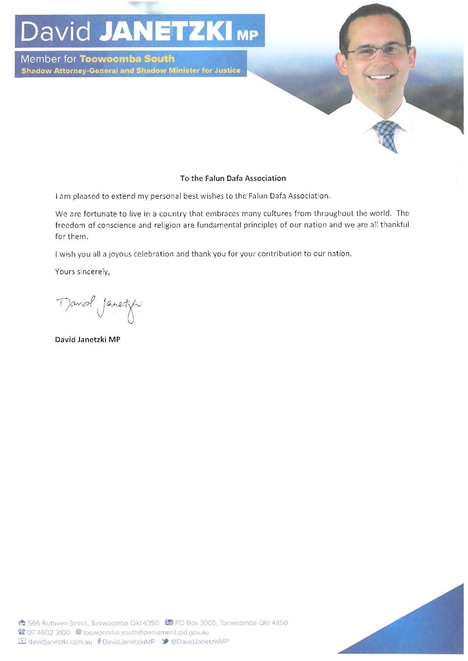 昆州影子法务厅长、Toowoomba South选区议员杨杨内斯基(David Janetzki)贺信译文: